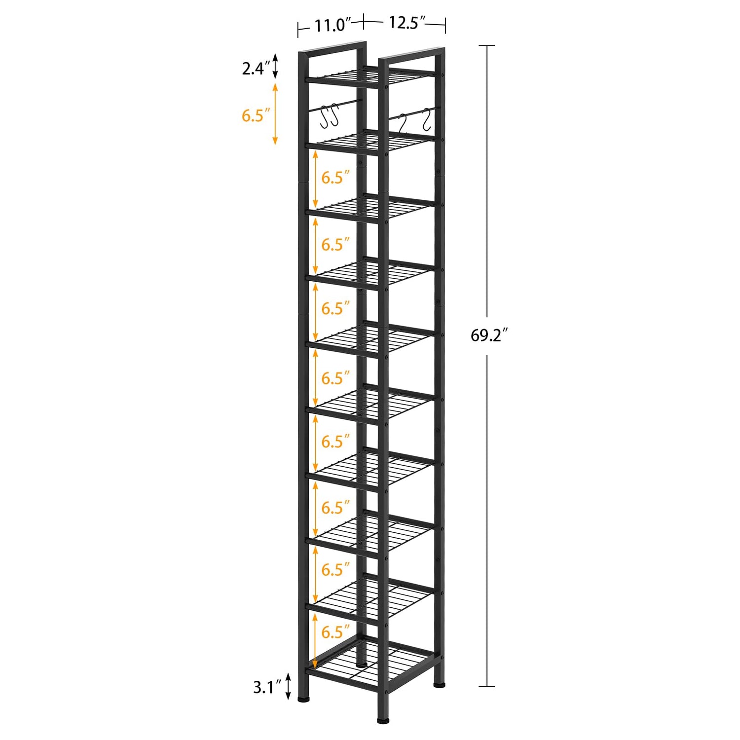 - Space-Saving Yet Large Storage: No right place for overwhelming shoes? USIKEY slim metal shoe rack helps! The 10-tier compact narrow shoe rack measures 12.5''L*11''W*69.2''H, which allows 10 to 20 pairs of shoes to stack. It covers a small square foot and fits any corner. The extra 4 S-shaped metal hooks also provide more storage