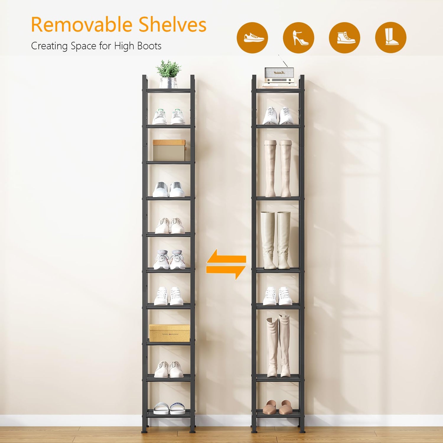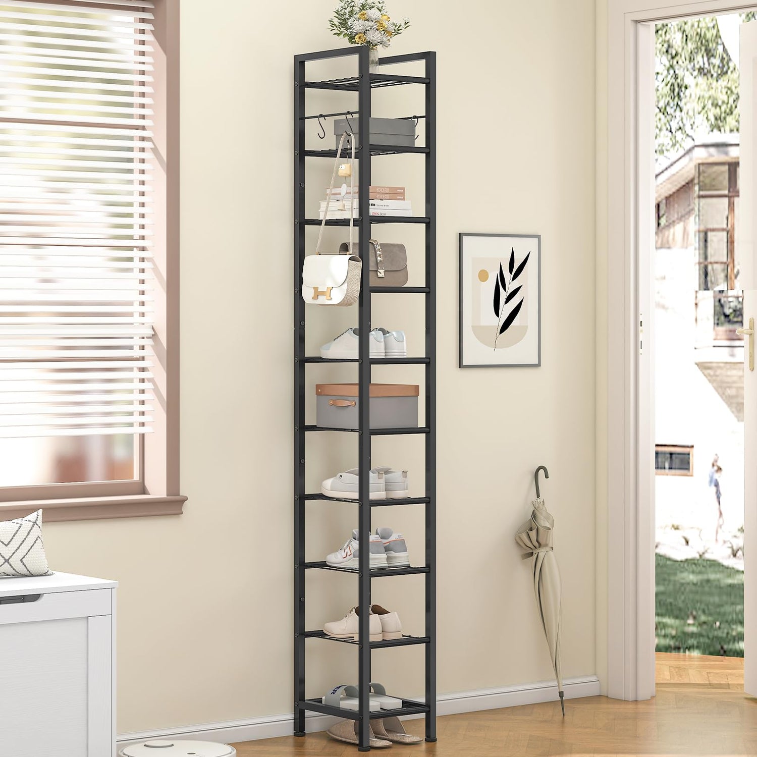 USIKEY 10 Tiers Narrow Shoe Rack for 10-20 Pairs - Sturdy Metal Tall Shelf With 4 Hooks, Slim Storage Organizer, Space Saving Vertical Design for Entryway, Closets - Black