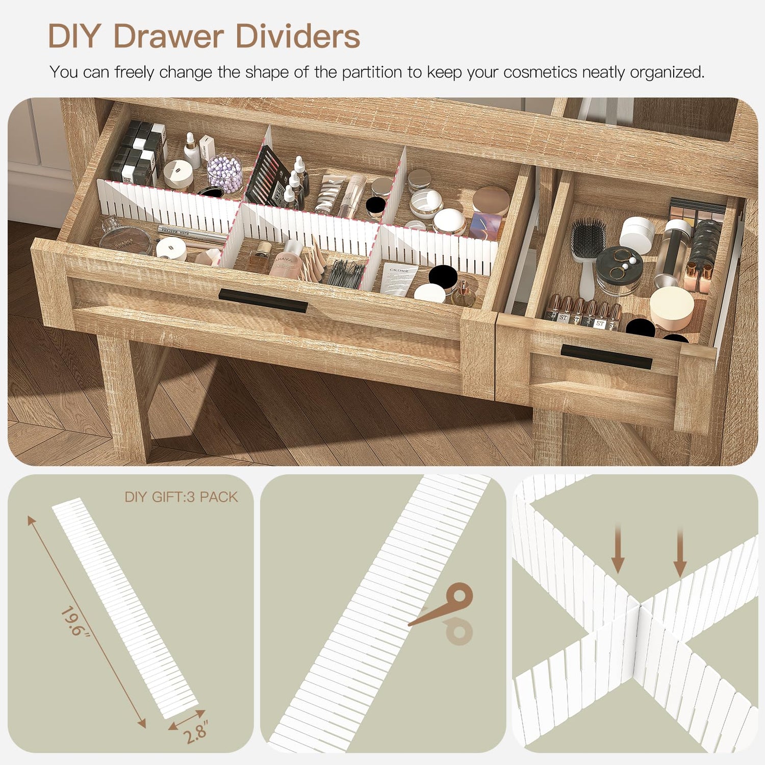 - ⭐【Makeup Vanity with Ample Storage Function】The adjustable storage shelves on both sides of the mirror and the long shelf at the top provide ample storage space for your cosmetics. Dividers in drawers make it easy to sort and organize your hair accessories and jewelry, and with a visible glass table top, you can easily find what you need at a glance; The cabinet with a barn door is large enough to easily store your hair dryers, curlers, etc, allowing all of your beauty supplies tidy in one place.