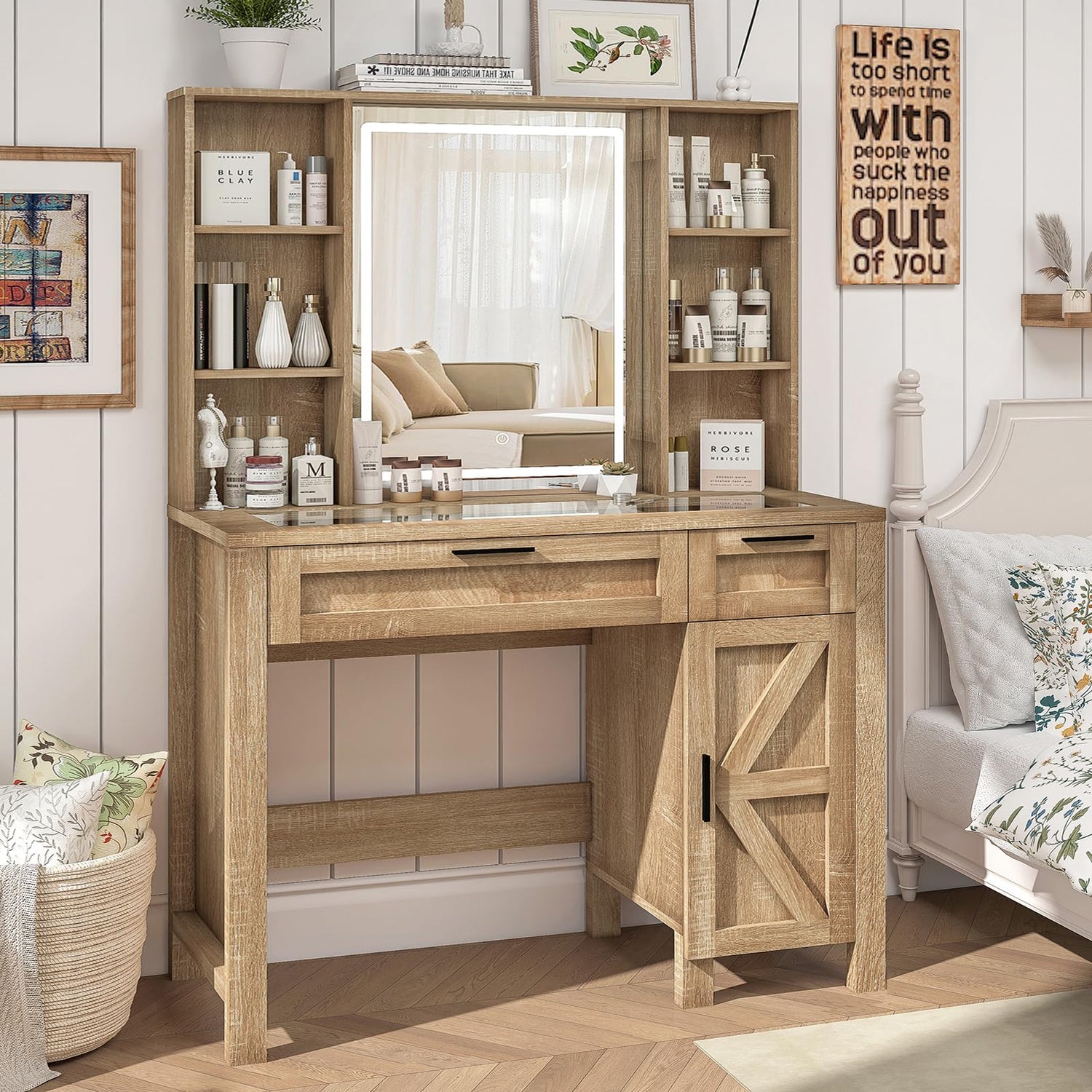 usikey Farmhouse Makeup Vanity Desk with Mirror and Lights, Glass Tabletop Makeup Vanity with Adjustable Shelves, Vanity Table Set with 2 Drawers and Side Cabinet for Bedroom, Maple