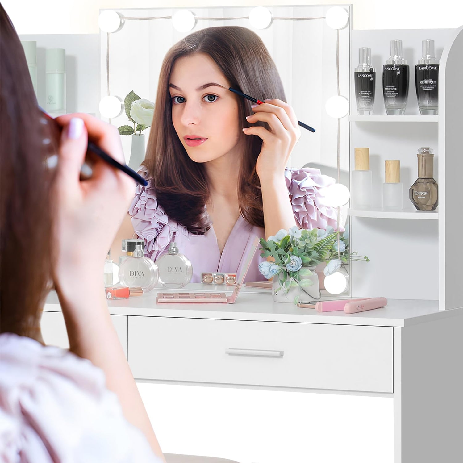 usikey Makeup Vanity with Mirror and 10 LED Lights, Vanity Makeup Table Set with 2 Drawers and Open Shelves, Makeup Vanity Desk Dressing Table with Cushioned Stool, White