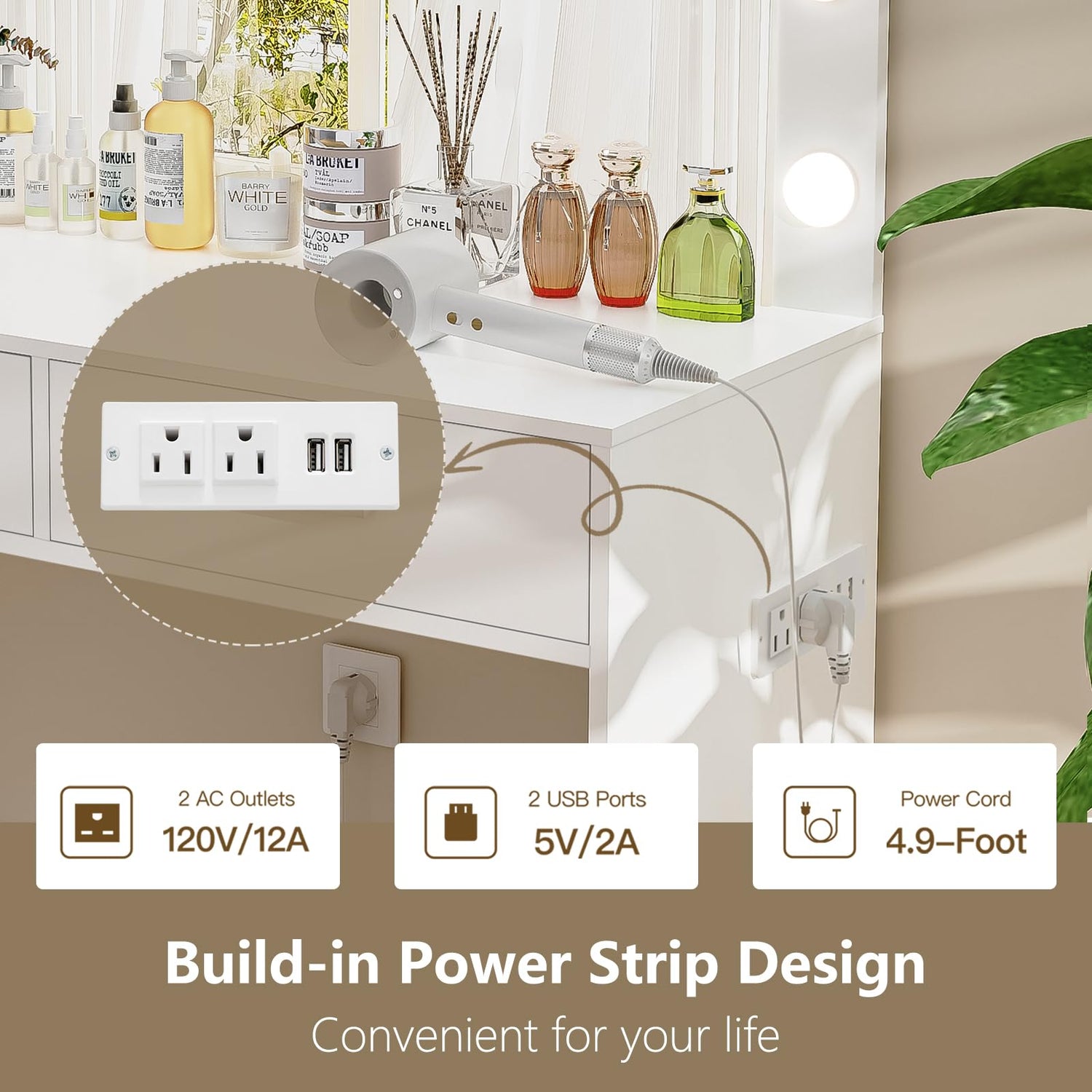 • Vanity Set with Charging Station: Upgrade design! USIKEY makeup vanity set added 2 standard plug sockets & 2 USB ports, more convenient for connecting curling iron, beauty device, hair dryer and phone charging, instantly completes a perfect hairstyle in front of this vanity(The charging center is specially designed setting on side of the vanity to reduce desktop clutter)