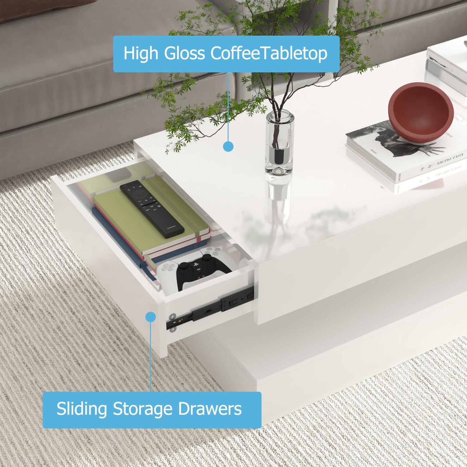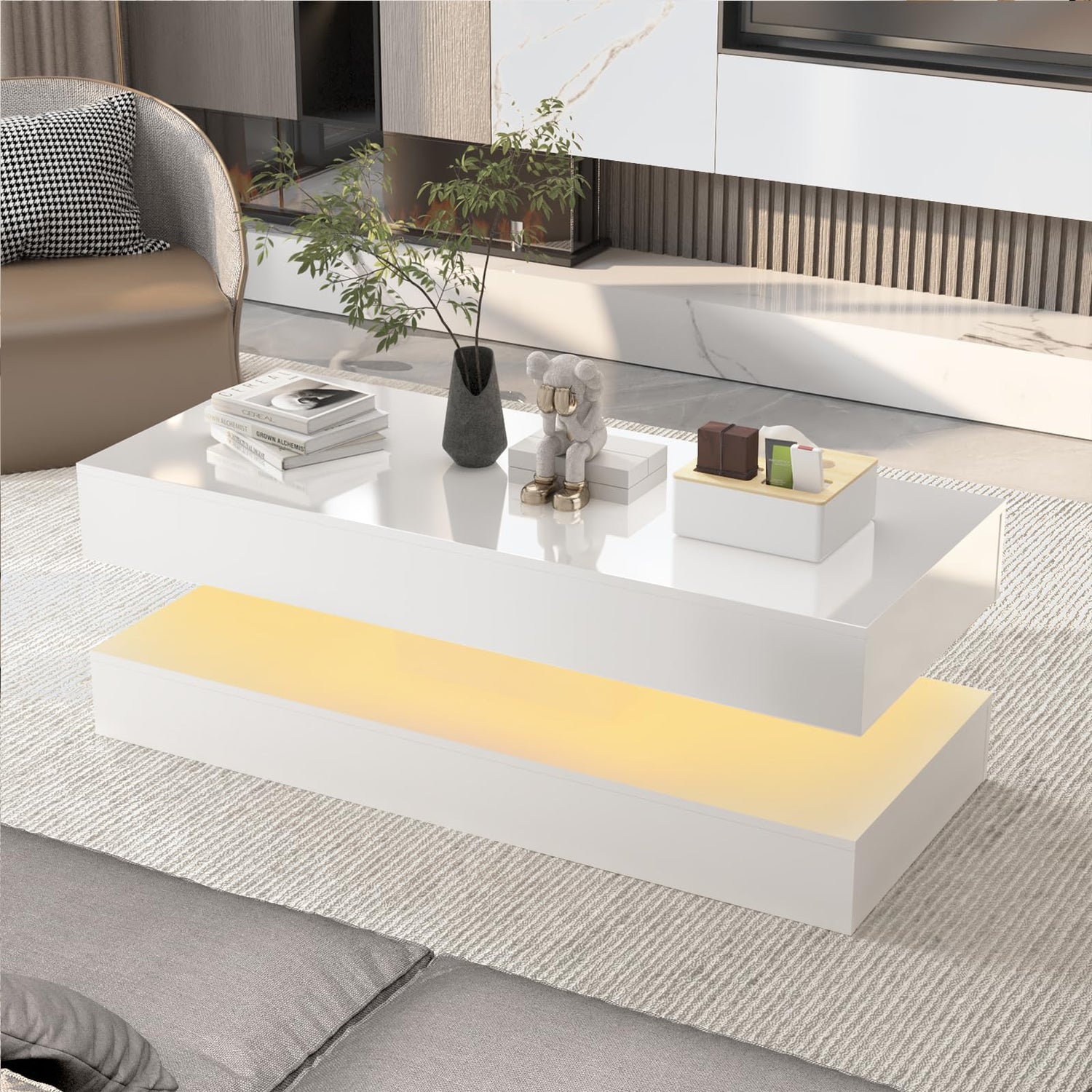 Uspeedy 47.3IN High Glossy LED Coffee Table,APP LED Lights,Black/White, Modern Furniture for Living Room (White)