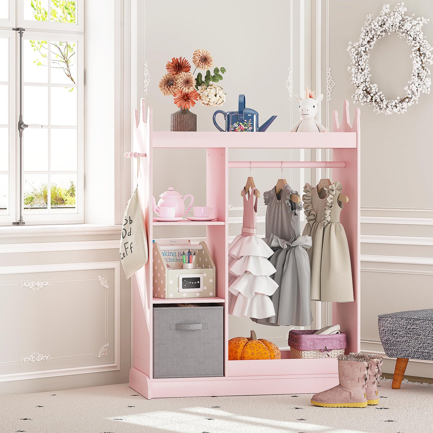 - FUCTIONAL & STYLISH: This Open Hanging Kids Armoire Dresser Closet is a Great Addition to Every Little Girl's Bedroom or Playroom. Great For Pretend Dress Up Vanity And Costume Change Or Just Everyday Preparation to Get The Day Started.