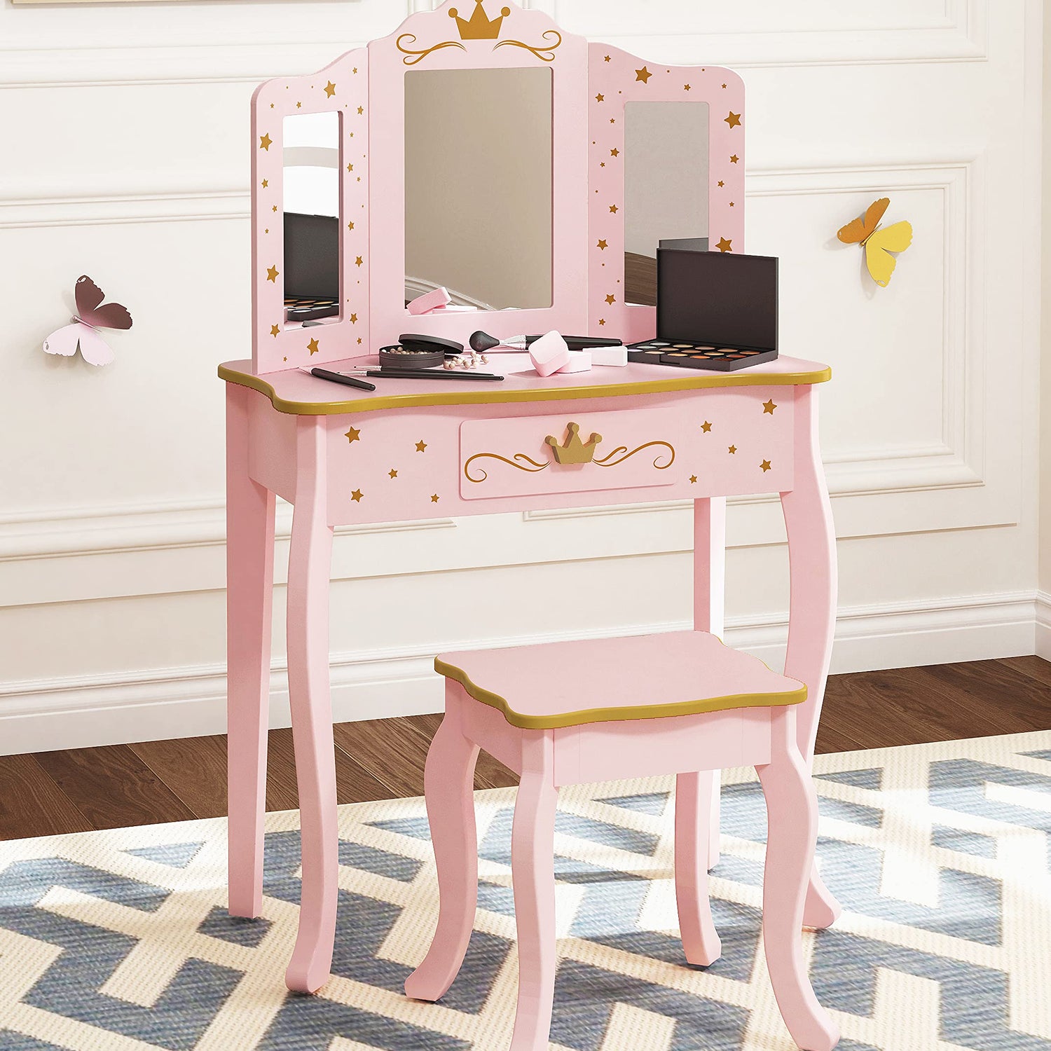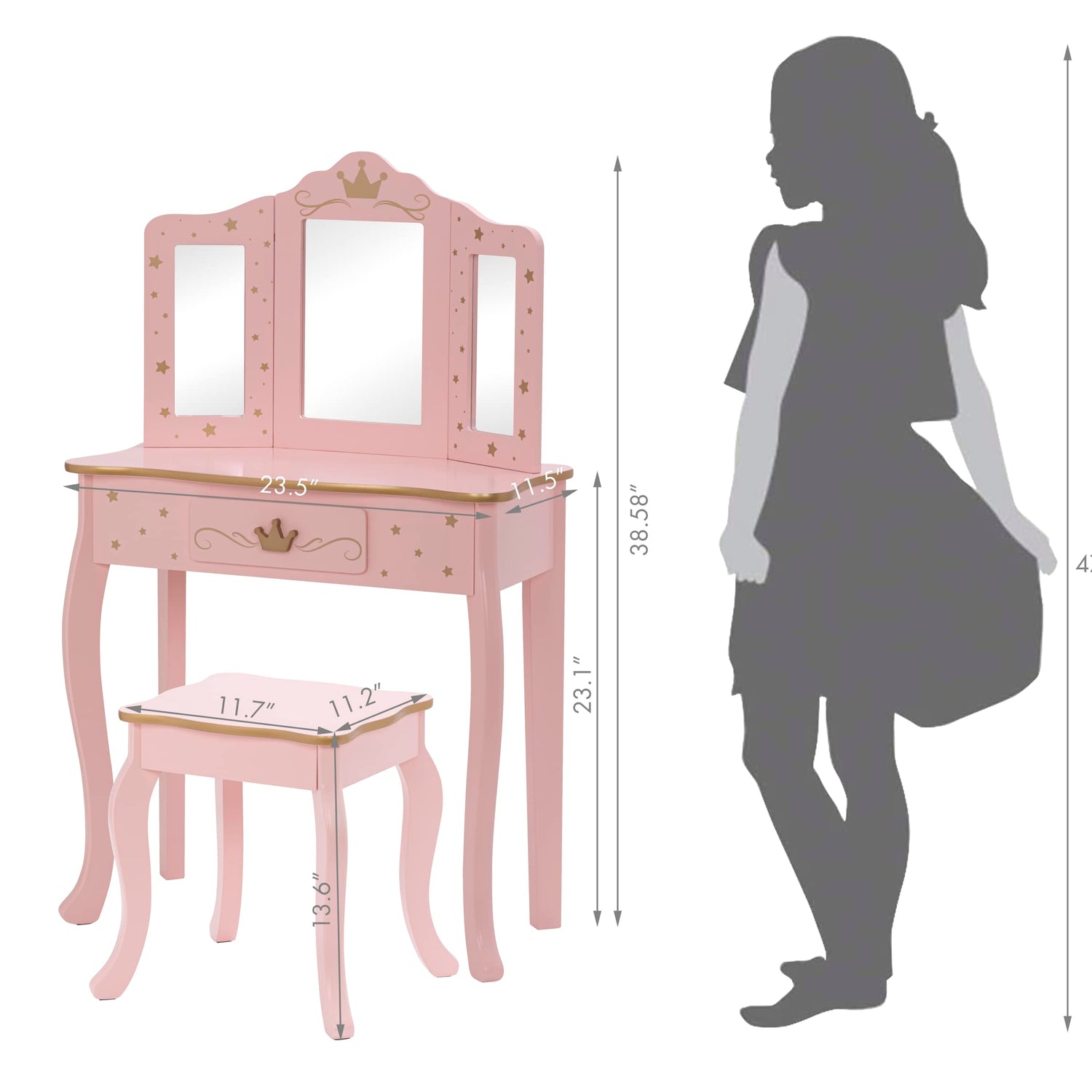 - FUNCTIONAL &STYLISH :This Pretend Play Kids Vanity Features Three-Pane Beveled Mirror Made Of Unbreakable Plexiglass For Better Reflect, A Pull-Out Center Drawer With A Knob Providing A Spacious Storage Area, Rounded Corner And Scalloped Legs On Both Table and Stool.