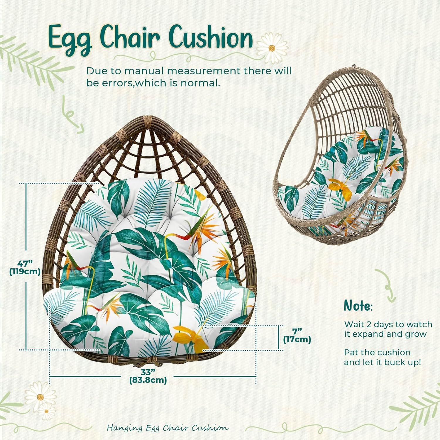 - Large Size: The outdoor egg chair replacement cushion dimension is 47x35x7 inch/119x89x17.8 cm. Fits most egg chairs on the market. Huge sized egg chair cushion wraps around your body adequately. Note: Please allow 1-2cm deviation due to different measurement methods