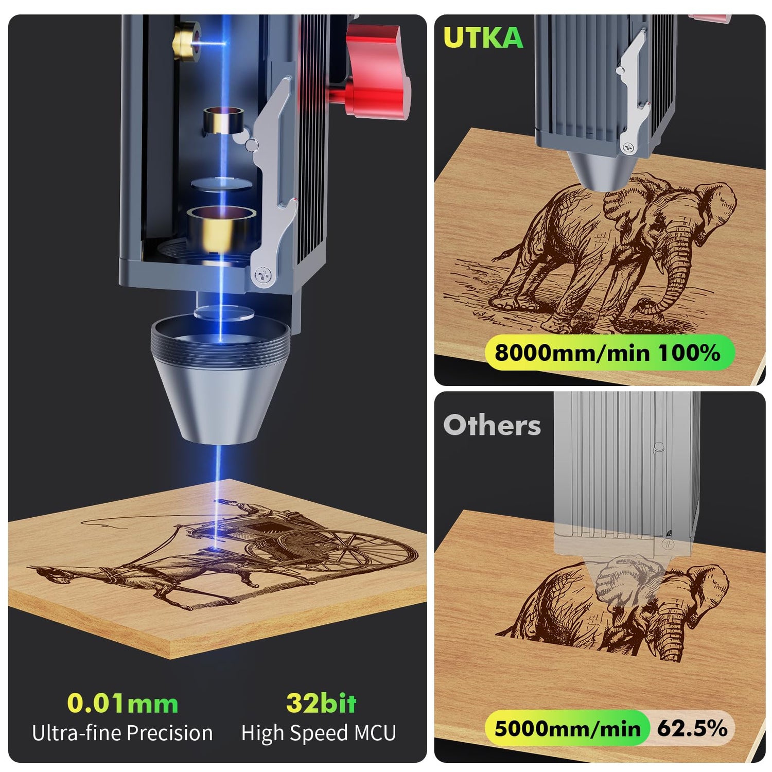 • Small But Powerful---UTKA 10W mini laser engraving machine with 32-bit high-speed MCU,100*100 engraving area.Support engraving and cutting. This portable laser engraver and cutter cuts up to 7-10mm light Pine wood,5-7mm Plywood in one pass. 10W: