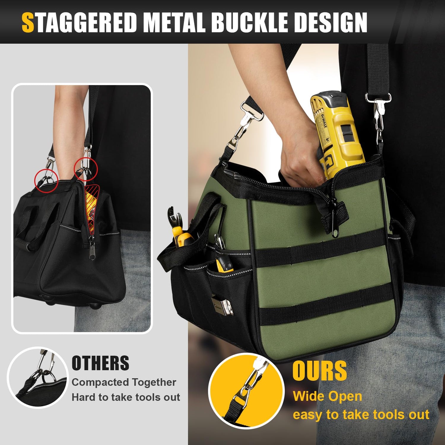 - Unique Shoulder Belt: The tool tote has a 45-inch adjustable shoulder strap, suitable for men of different heights. The staggered metal buckle design allows for easy opening and closing of the bag while wearing it. Comfortable handle provide additional carrying options.