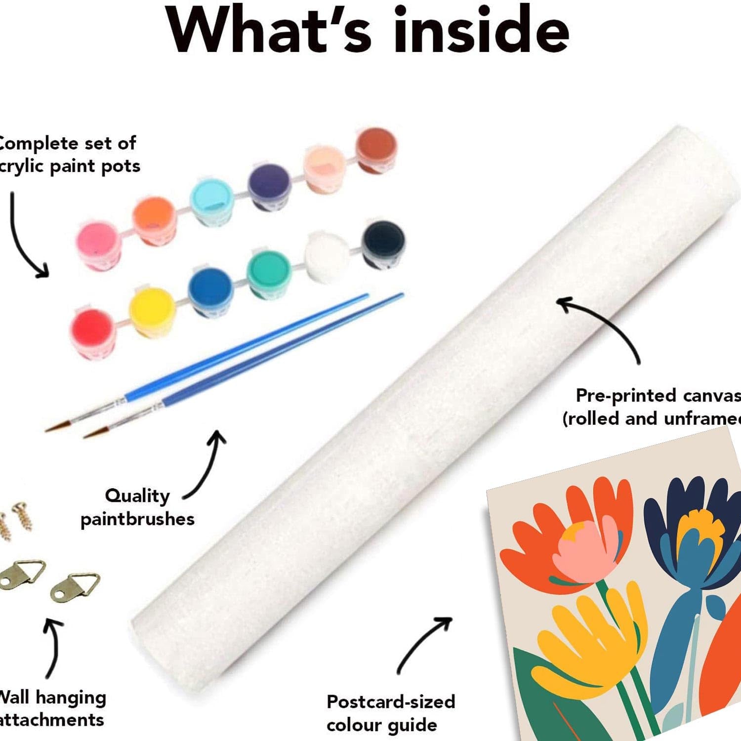 - COMPLETE TOOL KIT: Acrylic adult paint by number kits on canvas Each package comes with 2 sets of 8x8" framed paintings, 2 sets of acrylic paints, 4 brushes and instructions.Open the package and you can start painting immediately.