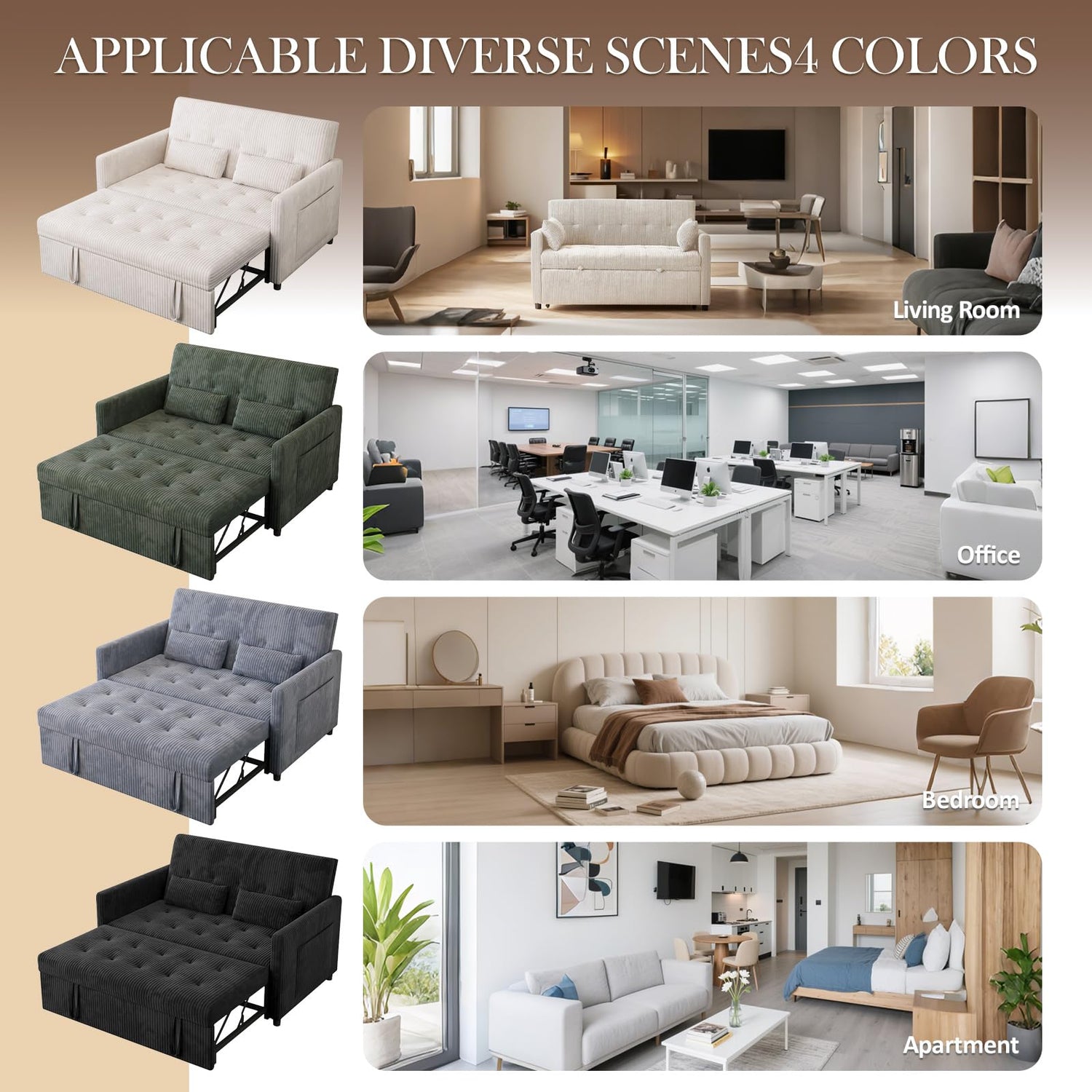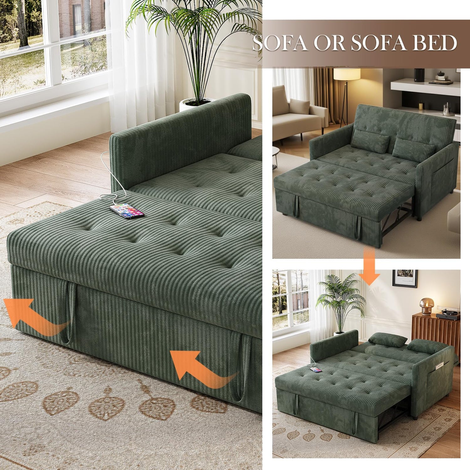 UXENAFANA Sofa Bed, Loveseat 3-in-1 Sleeper Sofa with Pull Out Bed, Pockets and USB, Modern 2 Seater Convertible Small Couch for Living Room Bedroom Apartment (Green, Corduroy)