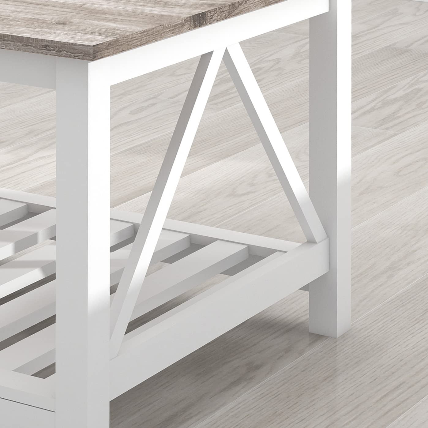- Slats Designed Open Shelf - Farmhouse coffee table and end table with storage open shelf is adopts fresh slats design which more rustic and minimalist. Supported by sturdy legs, this white and oak grey sofa centre coffee table is able to hold up to 100lbs.