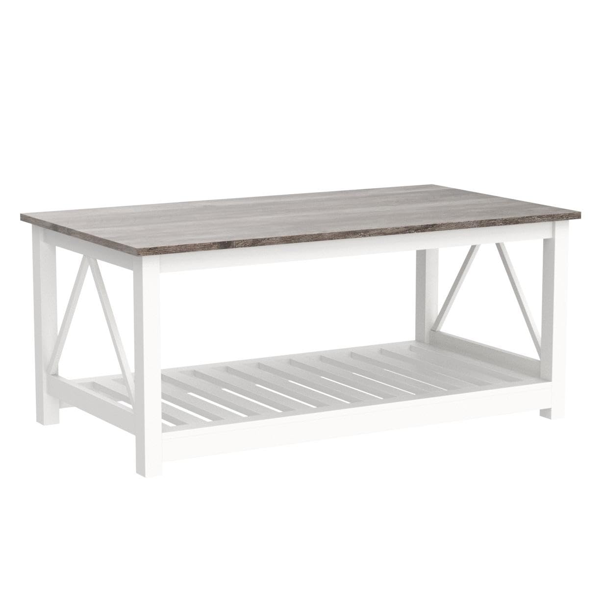 - Slats Designed Open Shelf - Farmhouse coffee table for living room with storage open shelf is adopts fresh slats design which more rustic and minimalist. Supported by sturdy legs, this white and oak grey sofa centre coffee table is able to hold up to 100lbs.