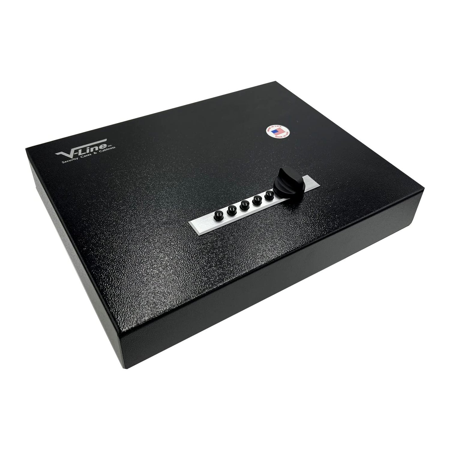 Details: The Top Draw XD is an upgraded version of our original Top Draw 2912-S BLK. The upgrade includes a heavy duty internal steel lock cover bolted to the lid with ¼” bolts secured to 3/8” steel welded blocks. This upgrade makes it extremely difficult to punch out the lock from the outside. The interior is lined with thick foam on the top and bottom to secure your firearm while traveling. The top opening case features an easily programmable five push button Simplex mechanical lock that does not require batteries. The Top Draw can accommodate up to two pistols depending on their sizes. It is nicely textured in a semi-gloss black powder coating and accented with a silver V-Line logo and stainless steel faceplate. The Top Draw has predrilled holes in the bottom and can be secured on top of most surfaces with bolts or by using our optional Quick Release mounting bracket (part no. 2912/3912-MB BLK).