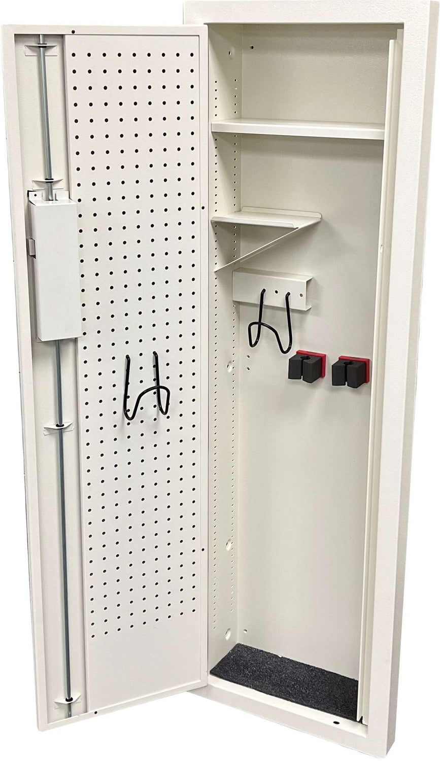 Details: V-Line's new Closet Vault Plus has been refitted with the all steel Peg Board as a standard item. The Closet Vault Plus will still have the new 3 Point locking system. The Peg Board adds additional strength to the door and allows for more options when configuring the in wall vault vs. the original Closet Vaults. The unique in-the-wall safe that fits between the wall studs (16” on center 2x4). The Closet Vault II provides a unique and space conscious way to secure firearms and valuables such as laptops, jewelry, and other items with the convenience of quick access. The door and frame protrude less than 2 inches from the wall, allowing it to be concealed behind a door or in a closet. The Closet Vault Plus with the installed Peg Board comes standard with two V-Line Custom Magnetic Barrel Supports.