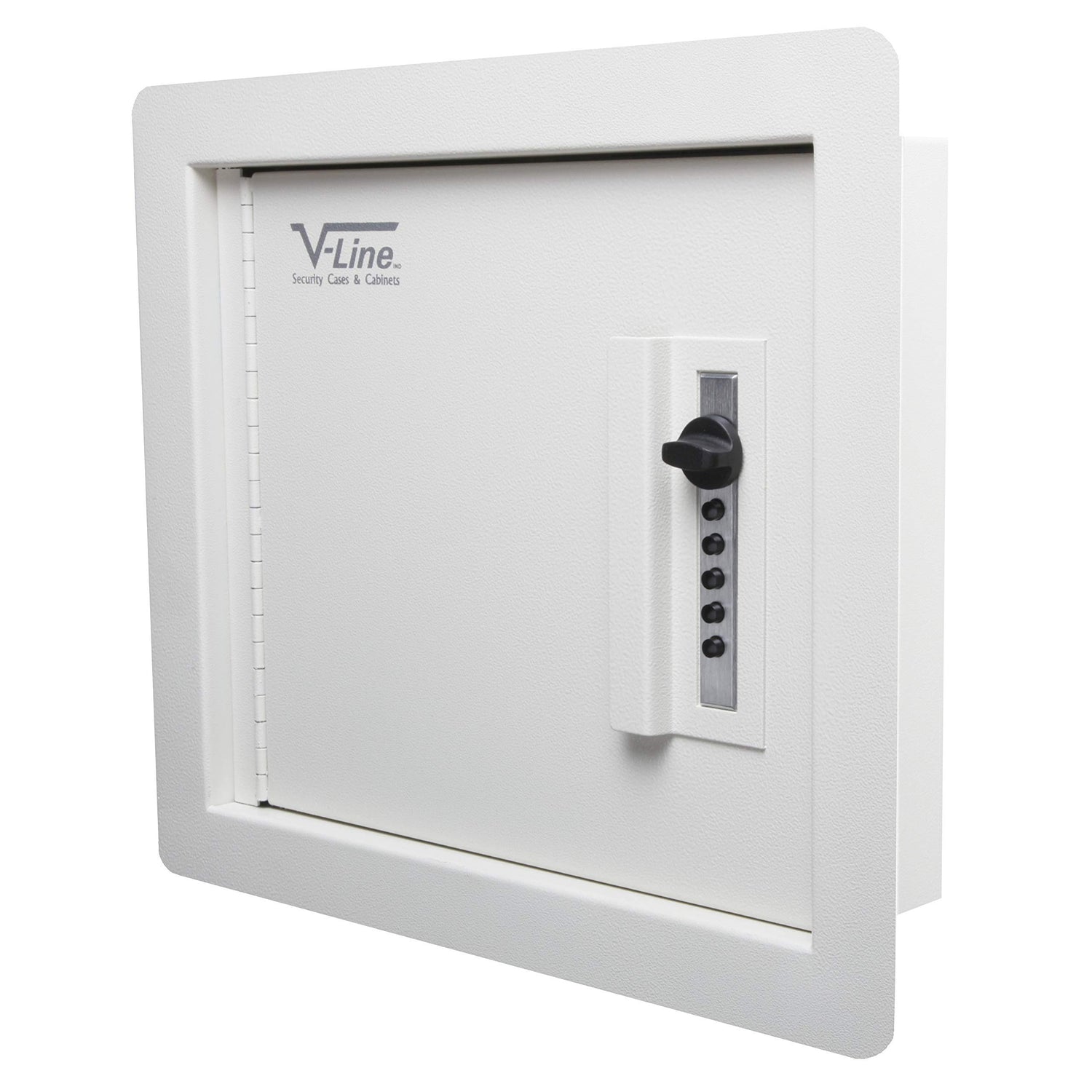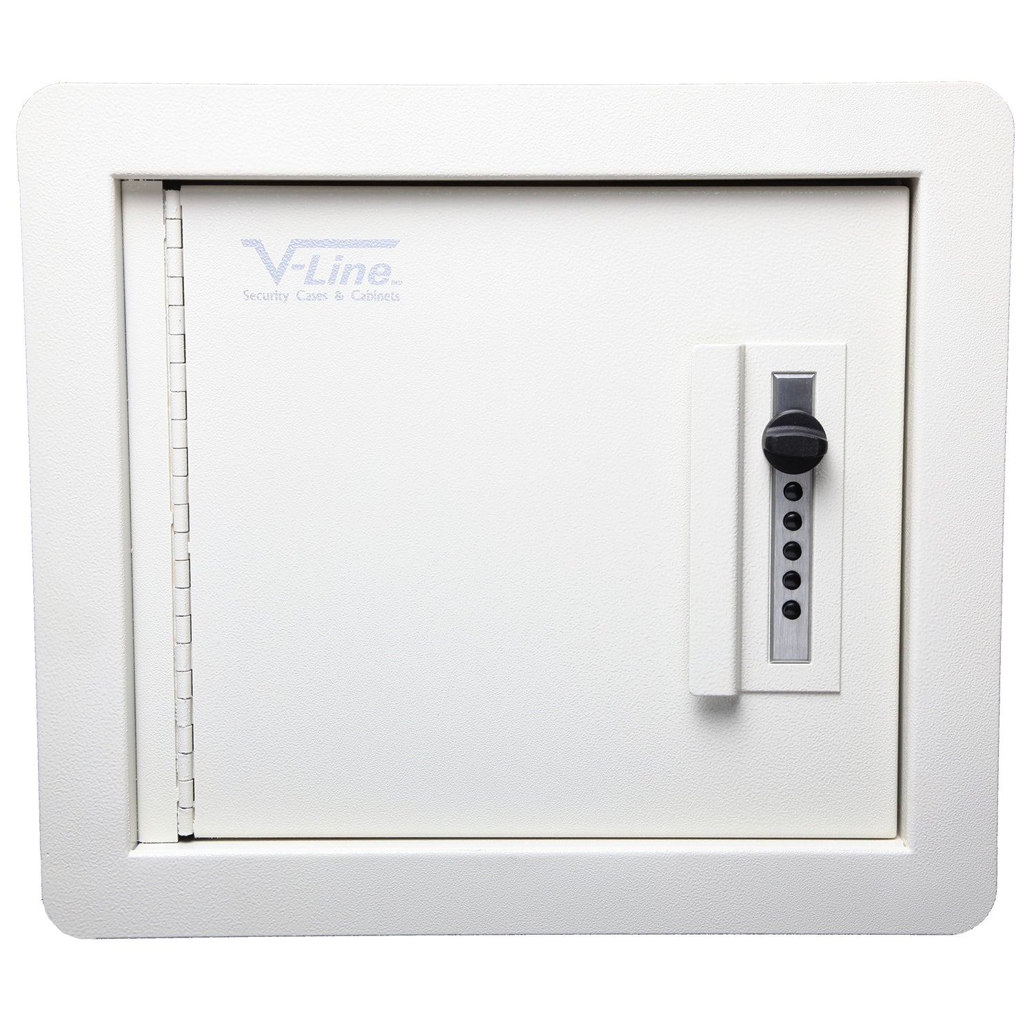 Details: V-Line’s Quick Vault is the perfect “Hiding Place” to secure small valuables and firearms without compromising quick and easy access, or interfering with room décor. The Quick Vault is designed to install in between the wall studs, the Case mounts flush with the wall’s surface; hang a picture over the Quick Vault for complete concealment. The attached bezel or frame gives a clean finished look hiding the drywall cuts. The door of the Quick Vault is inset for both flush installation as well as maximum security. An inner steel frame gives added protection to the door guarding against prying attacks. The push button lock is mechanical offering quick and easy access with no batteries to fail or keys that can fall into the wrong hands. The combination is easy to set and change, with 1081 possible codes. Felt lining on the walls and back cushion contents. An adjustable felt lined shelf provides additional storage space. The Quick Vault is large enough to comfortably hold wallet, jewelry, and small valuables. Standard Features: 1) One adjustable felt lined shelf included. Additional shelves are available for purchase. 2)Five button mechanical lock for quick access with 1081 possible combinations. 3) 3/8" thick steel lock block welded to cover guides and adds strength to the lock bolt. 4) Prepunched holes for easy installation. 5) Lock bolts directly through the inner frame of case to prevent prying. 6) Sturdy fabricated steel construction with pry resistant clamshell design. 7) Continuous hinge is welded on one end to prevent pin removal.