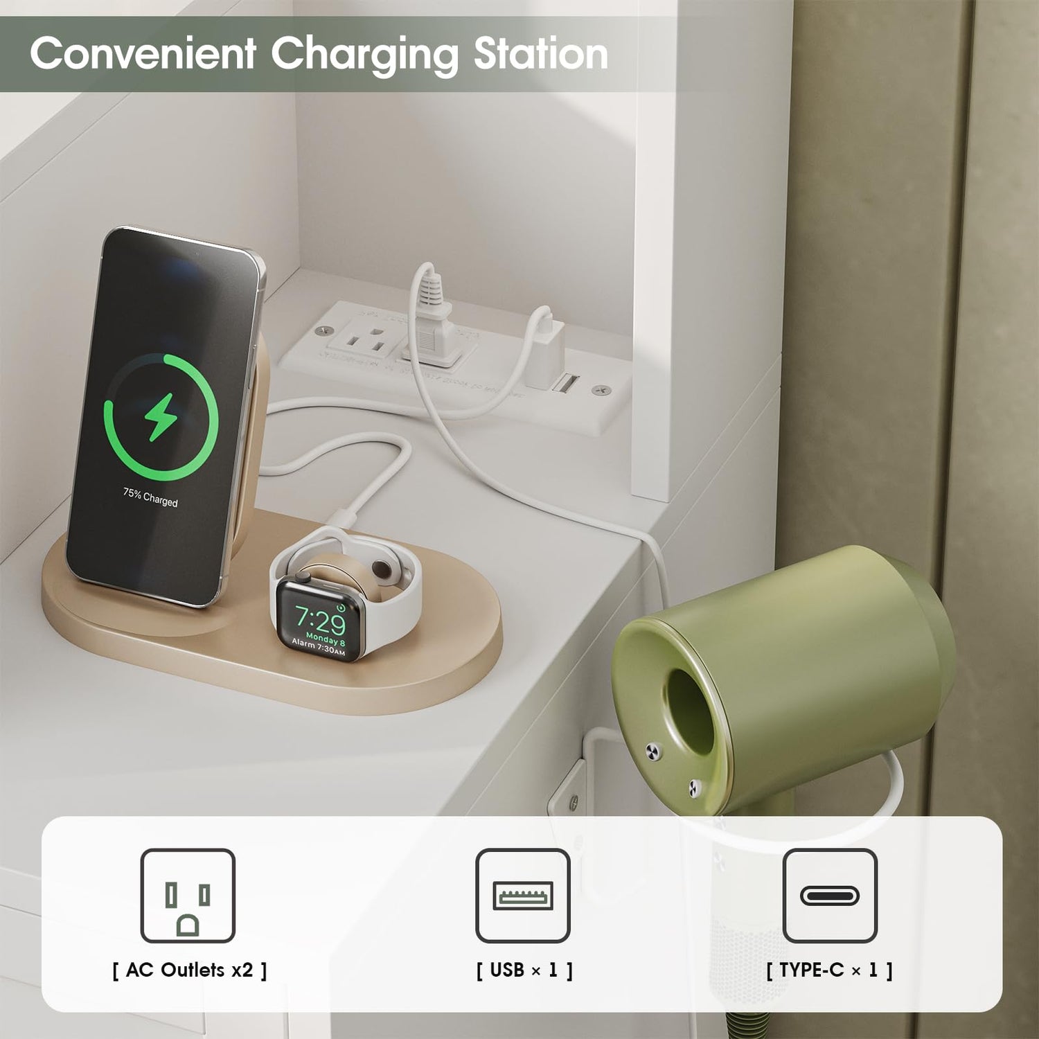 - 【Vanity Desk with Charging Station】Farmhouse makeup vanity desk combines beauty and practicality. Built-in charging station and hair dryer rack, including 1 standard outlet + 1 USB port + 1 Type C port. You can easily connect to the power supply while sitting in front of the vanity table, use hair dryer, curling iron or charge your cell phone to complete your exquisite makeup and hairstyling.