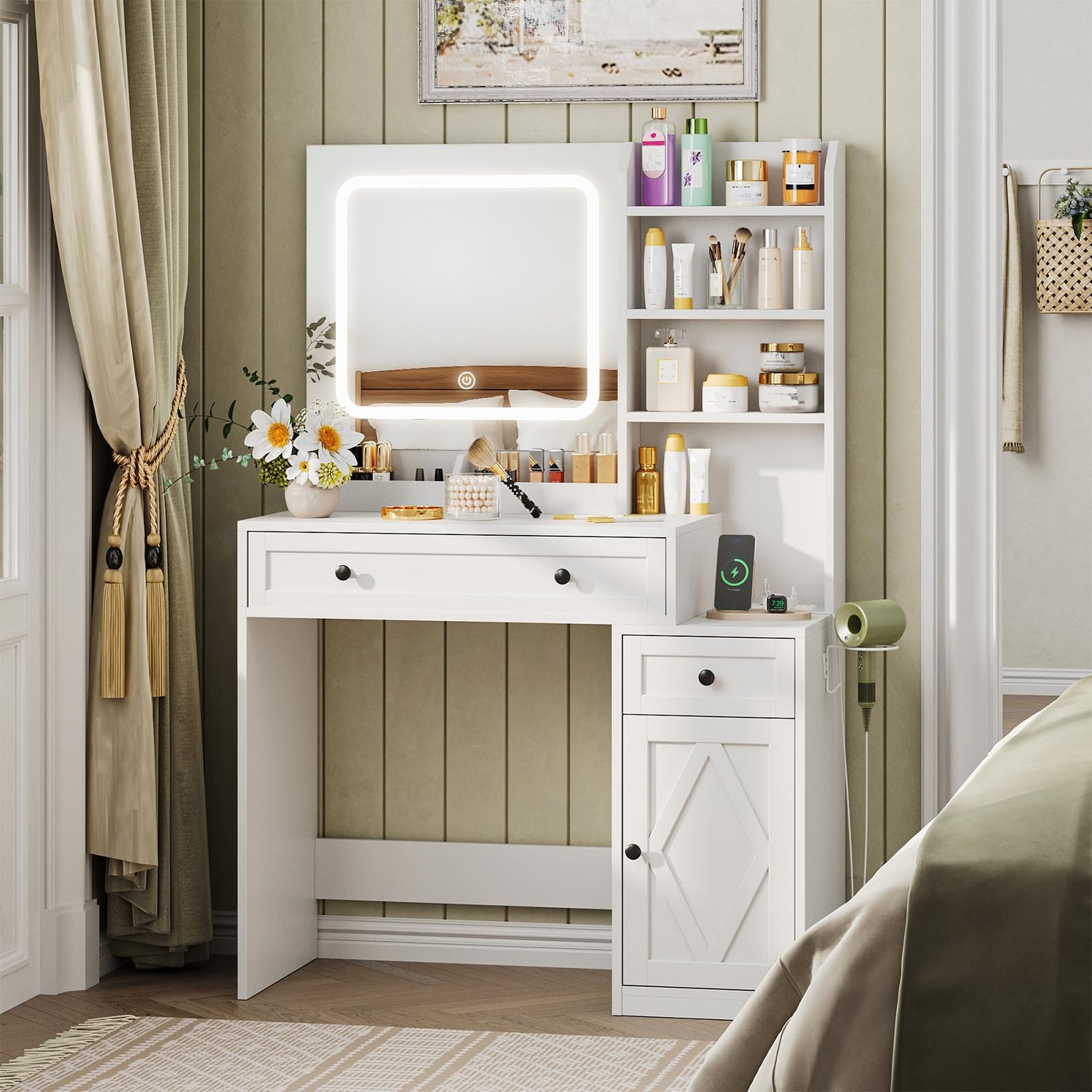 Vabches 35" Vanity Desk with Mirror and Lights, Farmhouse Makeup Vanity with Drawers & Power Outlet, Vanity Table with 3 Color Modes, Vanity Desk for Bedroom, White