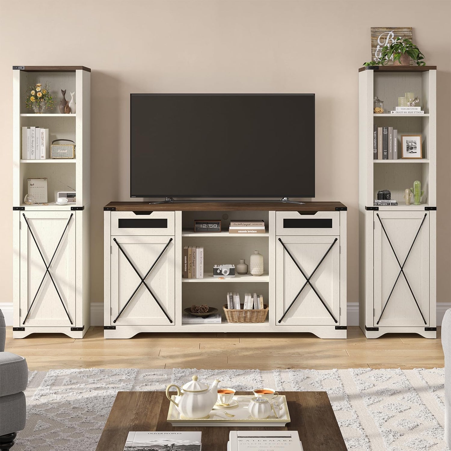 Vabches 5 Tier Bookcase with Doors Set of 2, 67” Tall Farmhouse Bookshelf with Storage Cabinet, Adjustable Shelves & Barn Door, Narrow Wooden Book Shelf for Living Room, Office, Antique White