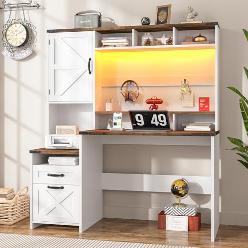 Vabches 51" Executive Desk Farmhouse Home Office Desk with Charging Station, LED Light, File Drawer, Storage Cabinet, Monitor Stand, Wood Computer Desk with Hutch for Work Study Writing (White)