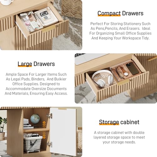 Vabches 60" Executive Desk with Fluted Drawers, Wood Home Office Desk with Storage Cabinet, Charging Station, Fluted Computer Writing Desk for Study, Living Room, Natural Oak.