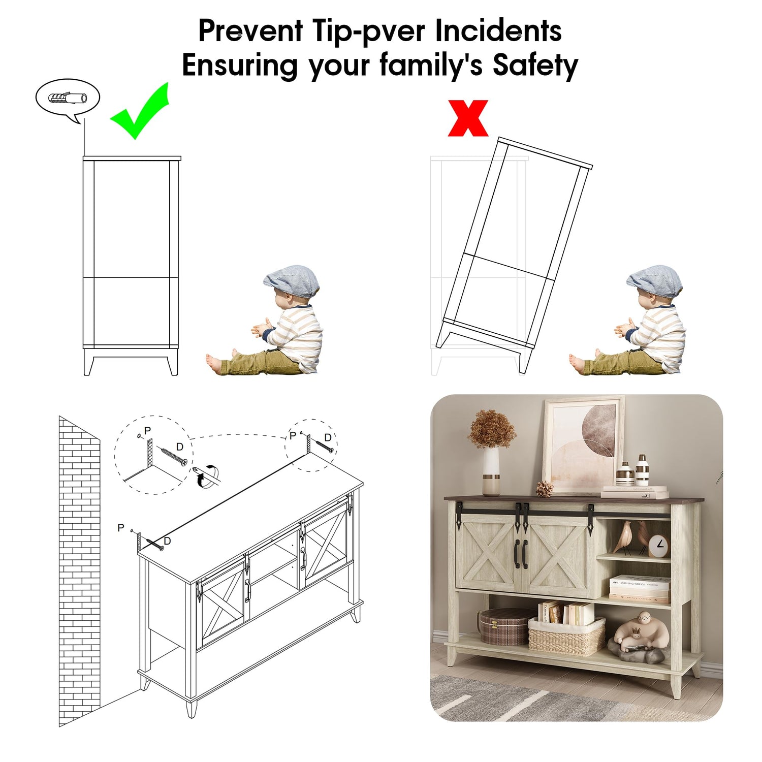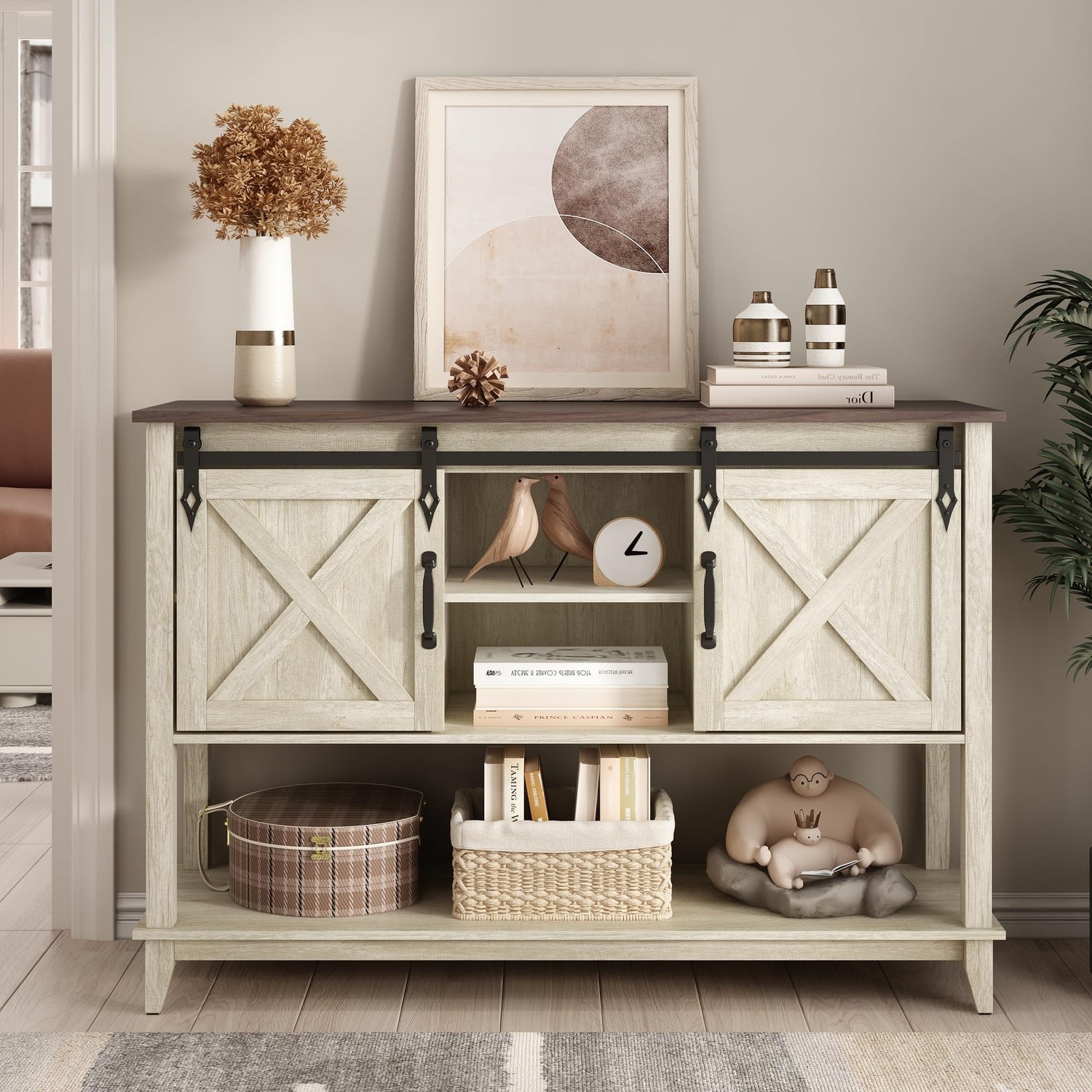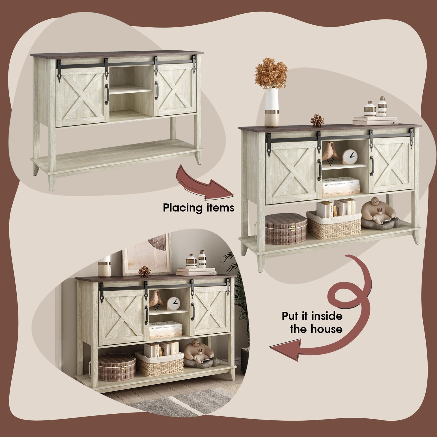 - 【Sliding Barn Door Console Table】: Features two removable barn doors for easy sliding and space saving. The simple design of the X line brings out the farmhouse style atmosphere, adding to the charm and beauty of the entrance. The sliding barn door features metal hardware that gives the entryway table a unique look and a great feel. High-quality slide rails ensure smooth sliding, you can also choose to slide the door to any side, creating a clean, organized entryway.