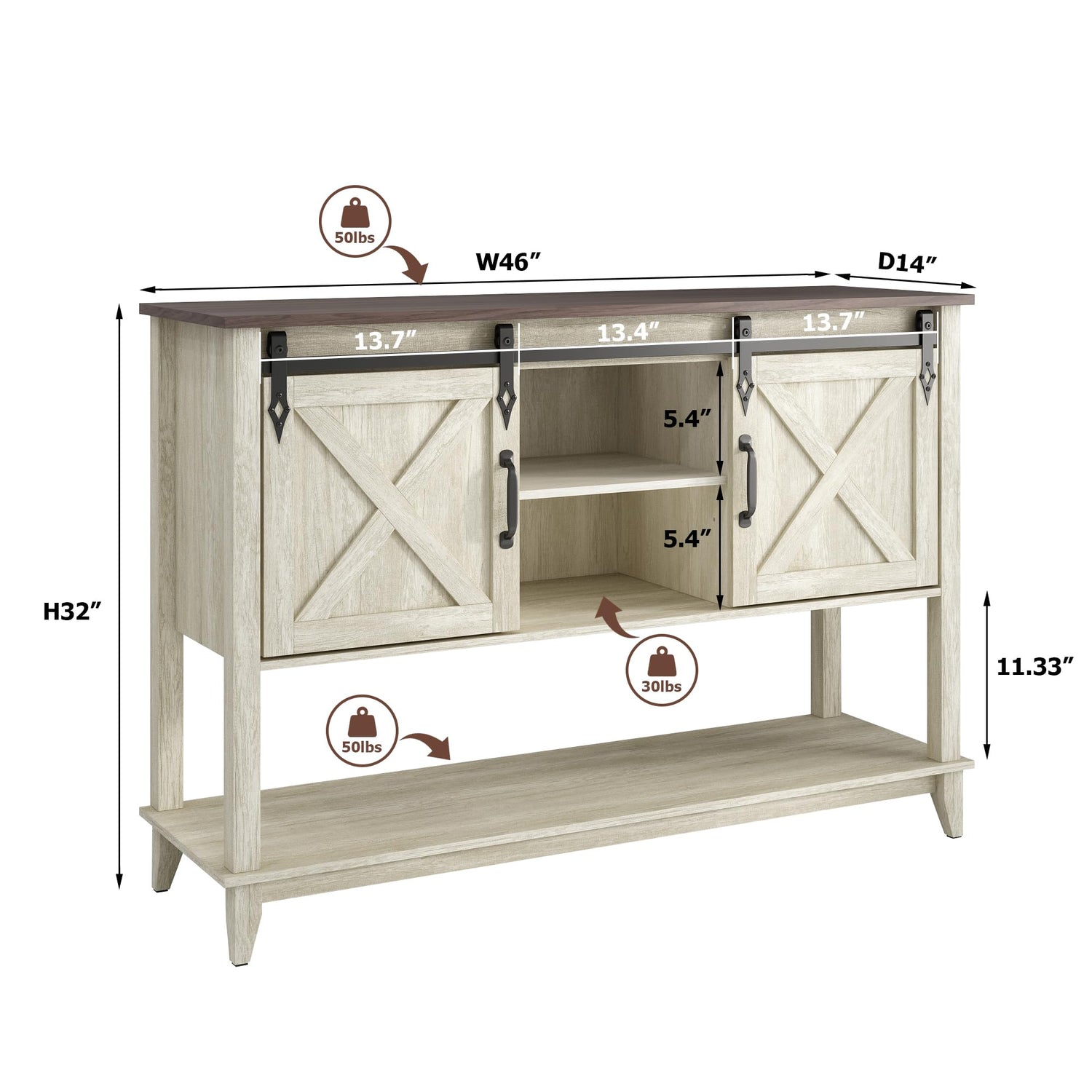 Vabches Entryway Table with 2 Sliding Barn Doors, 46" Farmhouse Console Table with Adjustable Storage Shelf, Sofa Table for Entryway, Hallway, Living Room, Metal Corner Trim & Handles, Rustic White
