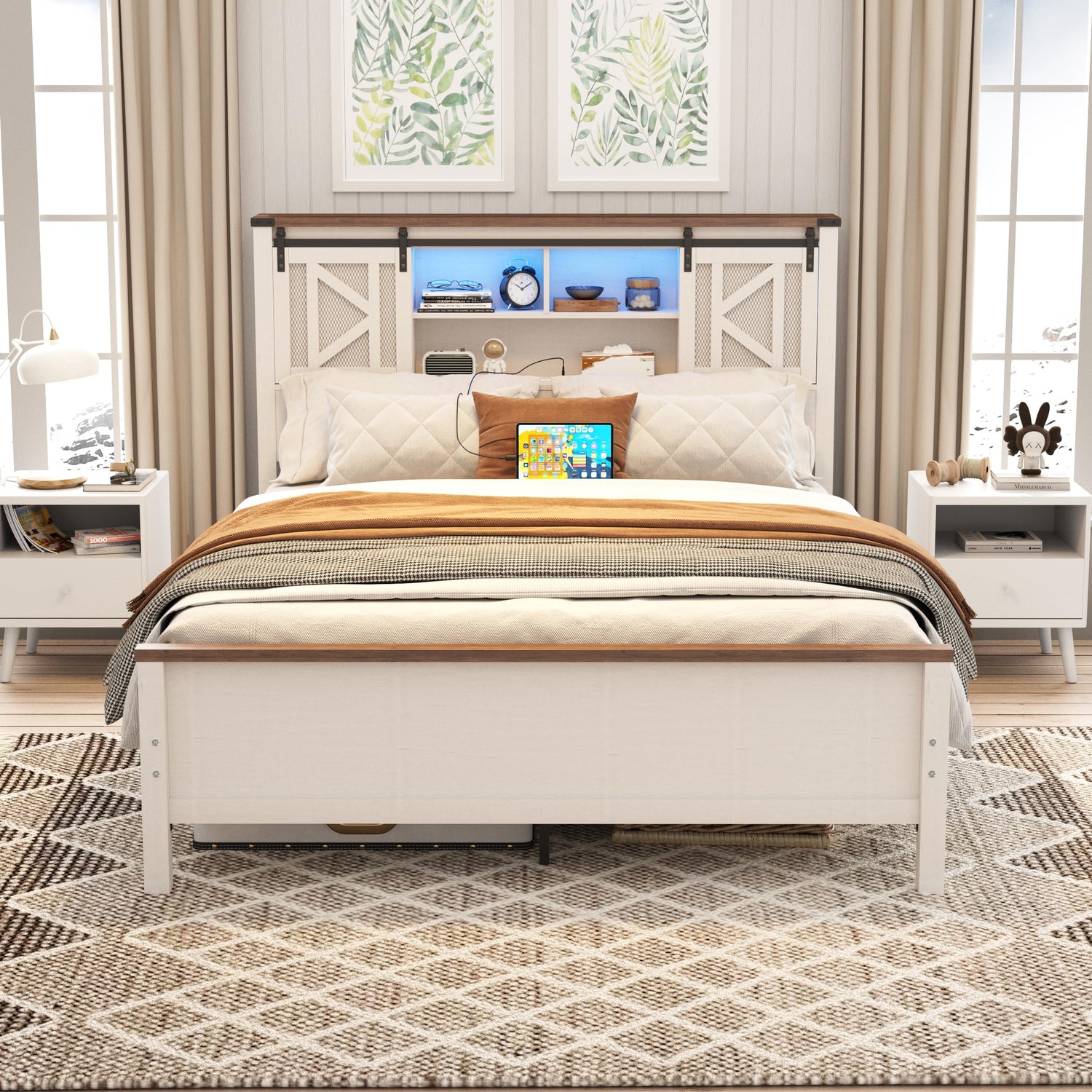 Vabches Farmhouse Queen Bed Frame with Storage, LED Lights & Charging Station
