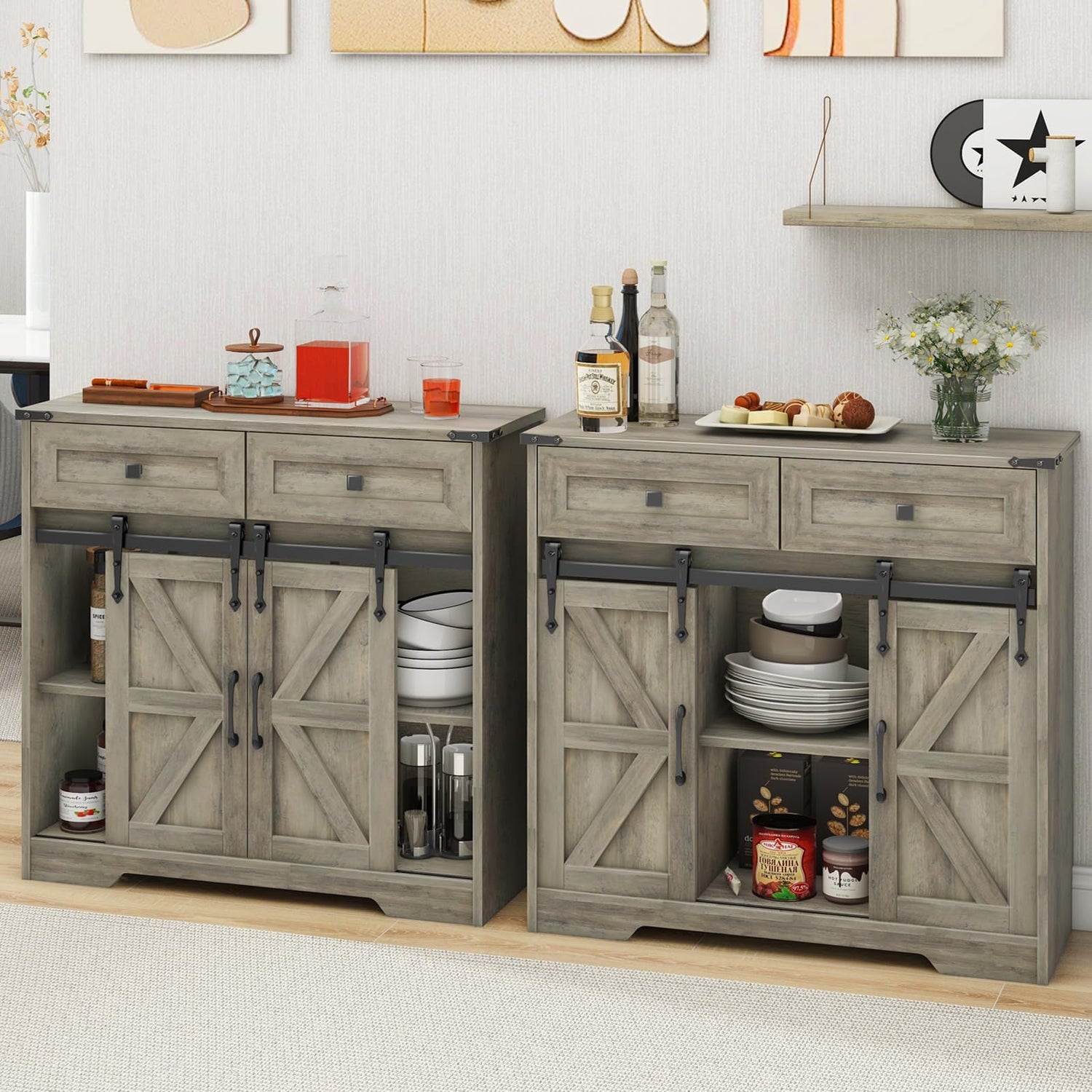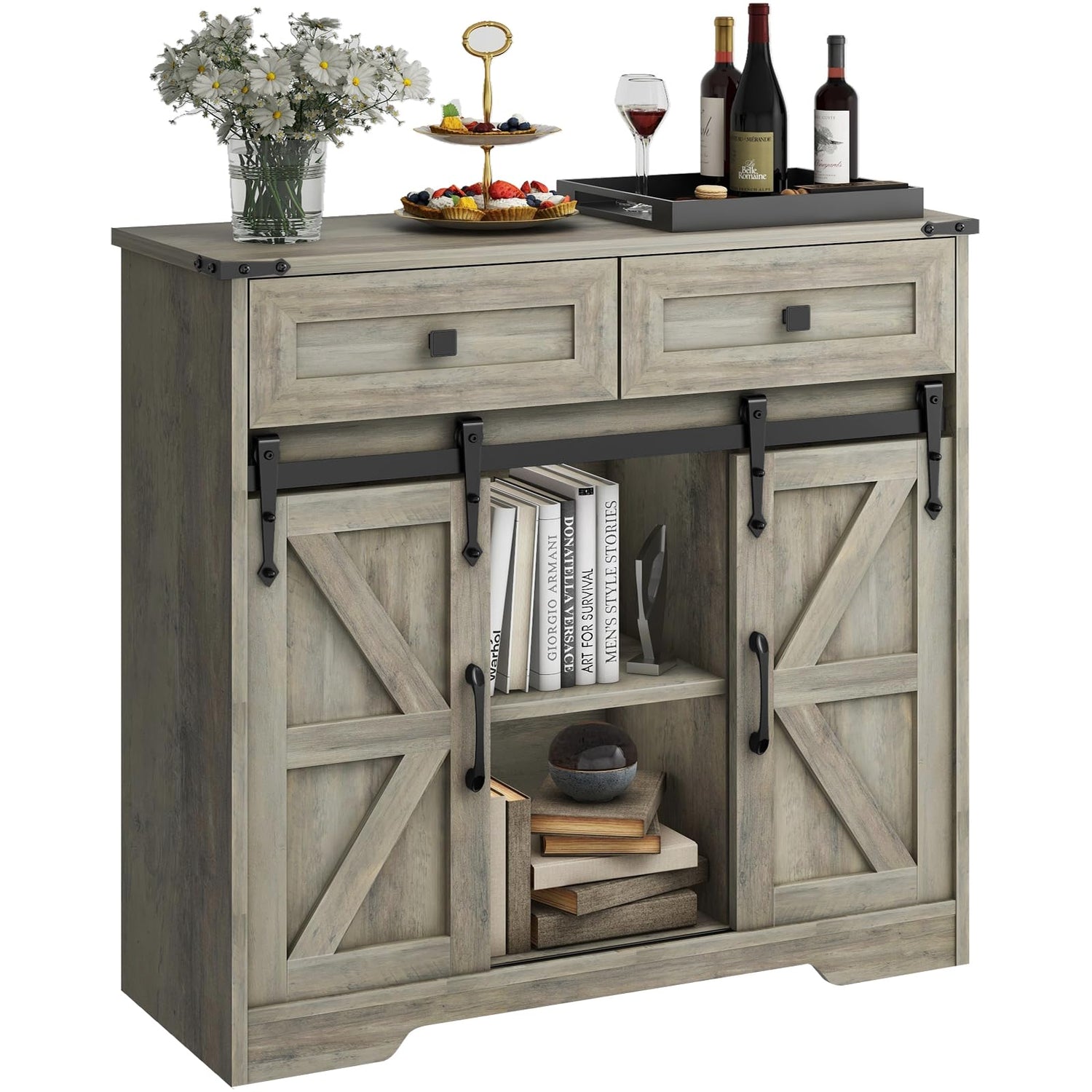 Vabches Farmhouse Storage Cabinet with Sliding Barn Doors and Drawers, Grey Freestanding Kitchen Pantry Cabinet, Floor Storage Cabinet for Bathroom, Living Room, Adjustable Shelves, Ample Space