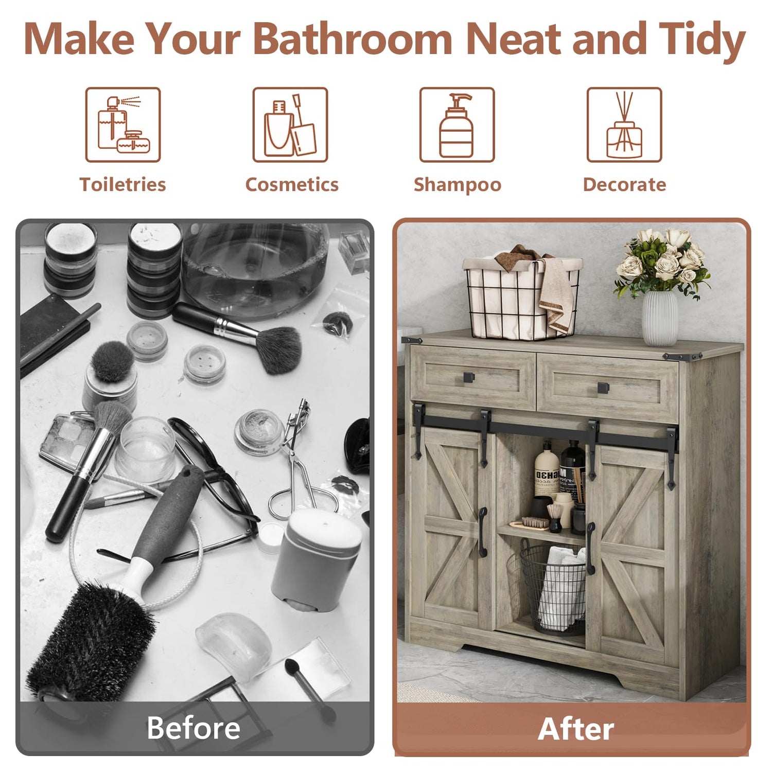 - 【CUSTOMIZED STORAGE SPACE】11.81"D x 31.5"W x 31.89"H, Utilize the tabletop to store supplies of any height, 2 storage drawers for small items. Also sliding barn door and adjustable shelf offer customized space to suit your diverse storage needs not only in bathroom.