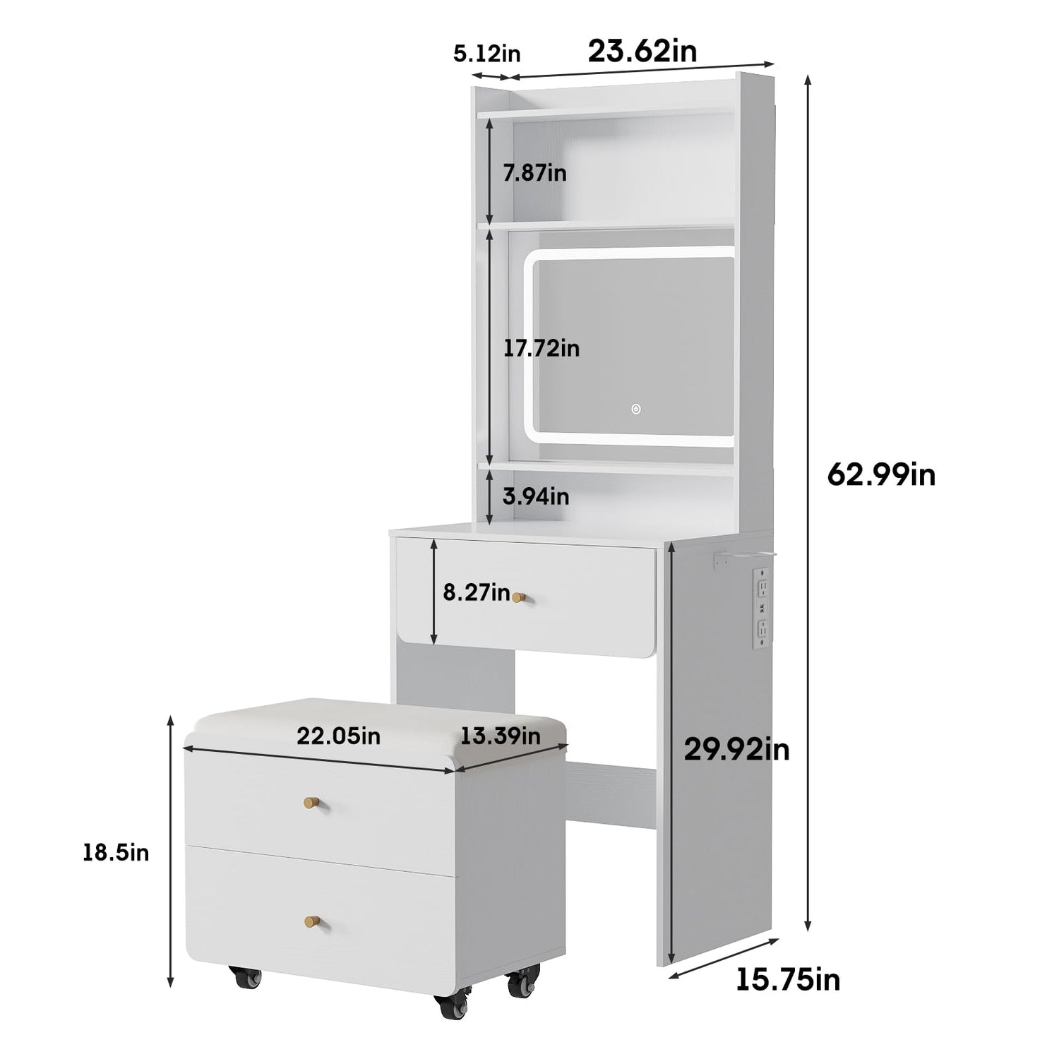 Vabches Make Up Vanity Desk with Mirror and Lights, White Vanity Table Set with Charger Station,Girls Small Vanity and Storage Chair