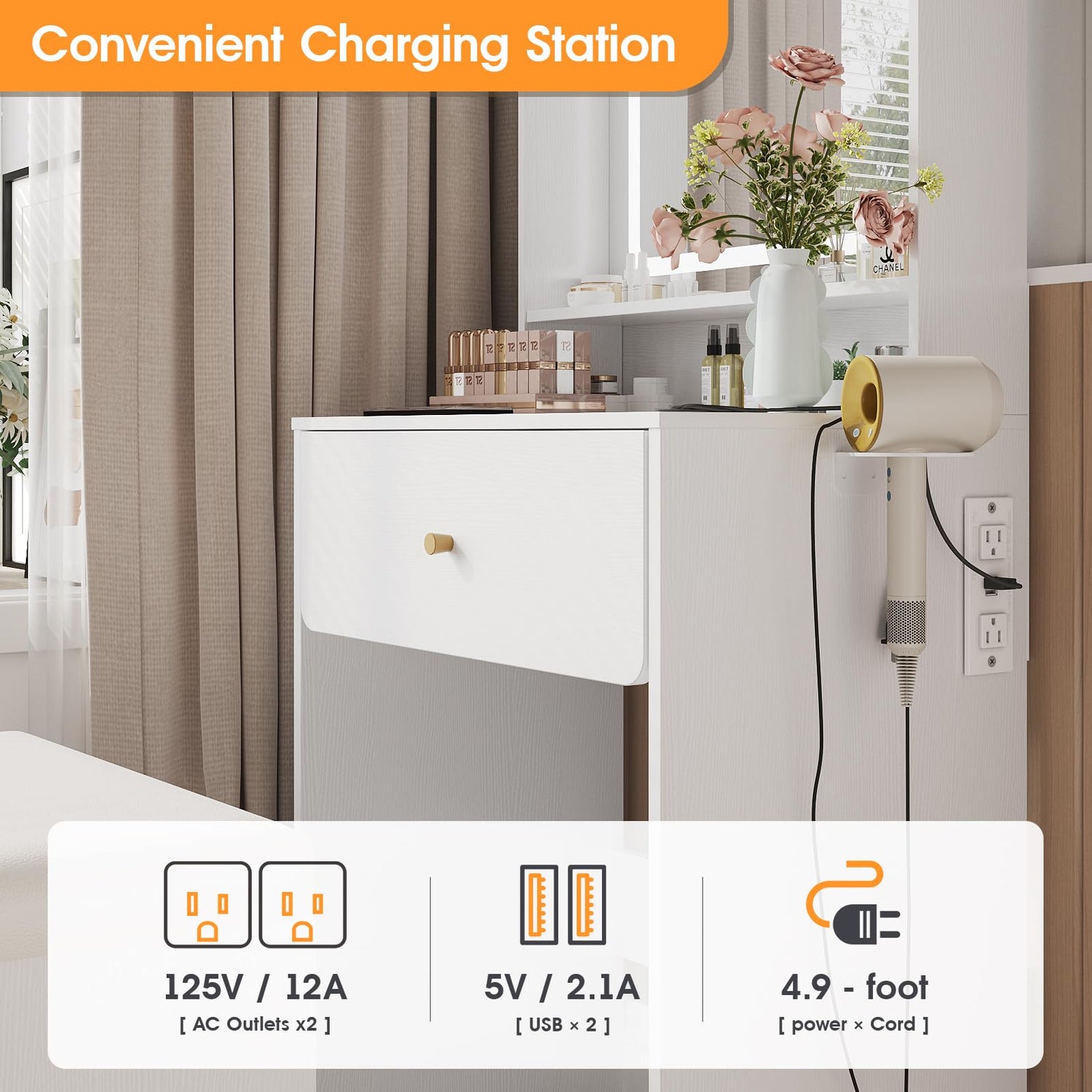 - 【Vanity Desk with Charging Station】This modern vanity desk comes with a power strip that includes 2 standard plug sockets and 3 USB ports, allowing you to sit at your vanity and use your hair dryer or curling iron within easy reach and charge your phone, tablet, or other electronics