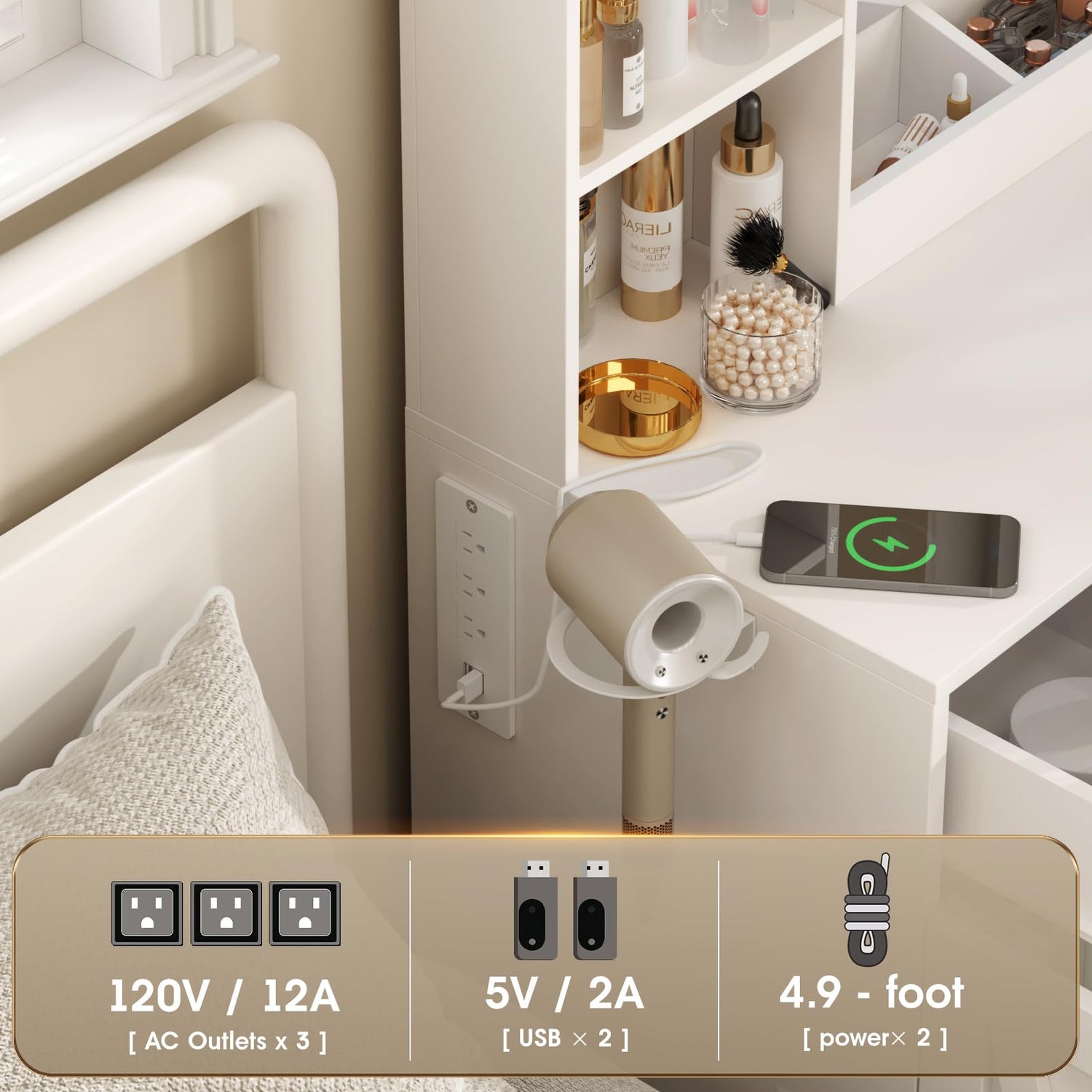 - 【CONVENIENT CHARGING DESIGN】The make up vanity with 5 built-in charging stations (3 outlets and 2 USB ports) will solve your problem of not having a port to plug in your hair dryer, and you can charge your phone while applying makeup at the same time. The desk also has a special hook to put the hair dryer conveniently.