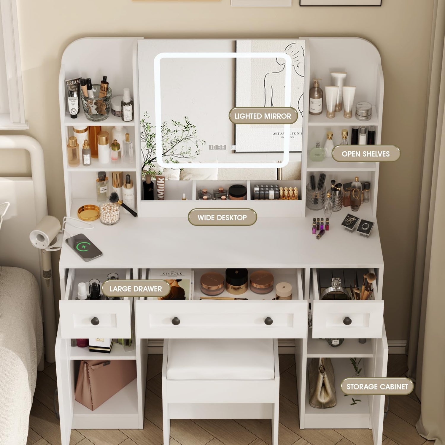 Vabches Makeup Vanity Desk, Vanity Mirror with Lights Desk and Chair, White Vanity Table with Large Storage Drawers and Shelves, Time and Temperature Display, 3 LED Lighting Modes Adjustable, White