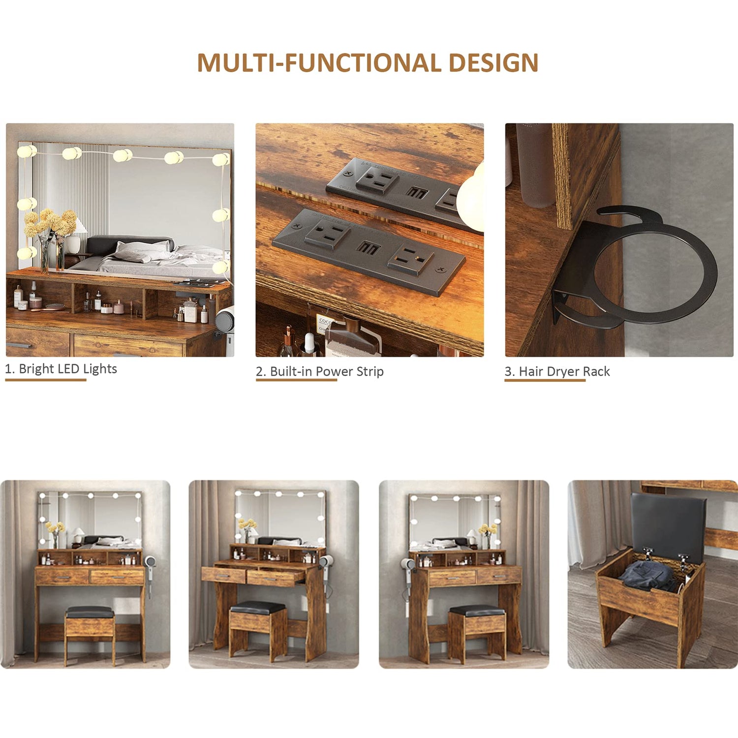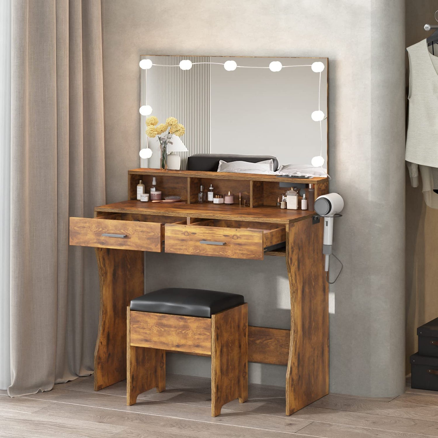 - đăVintage Brown makeup vanityăElegent vanity desk with mirror and lights, enhances the beauty of your bedroom and look more attractive. The graceful contours of the make up table leg, make your every stand up more convenient. 15mm MDF board wooden vanity, flat and study structure, can be used for many years, happy gift for daughter, wife, mom, suitable for teen and adults.