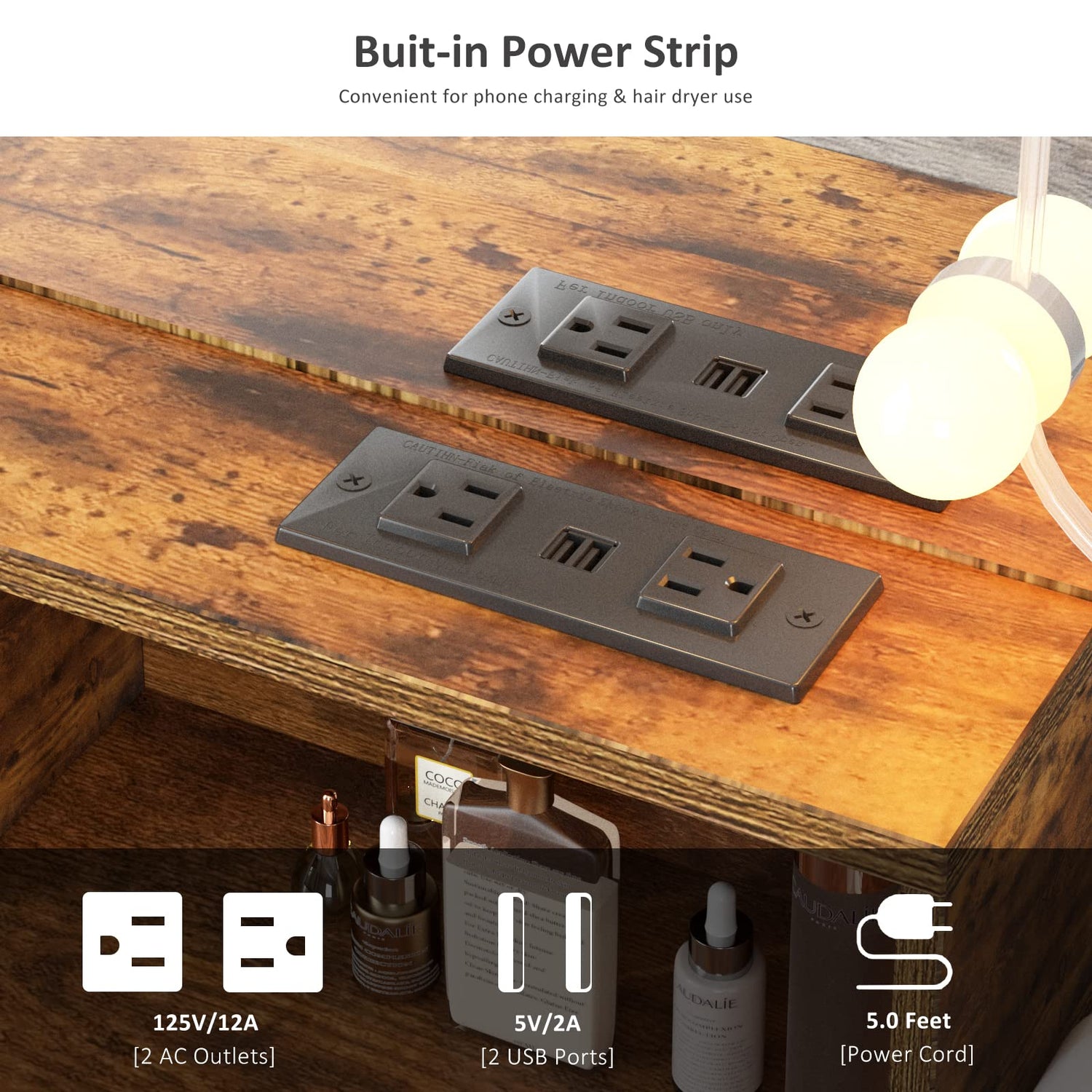 - đăBuilt-in Charging StationăNew Design functional makeup table, with 2 standard plug sockets and 2 USB ports on storage shelf, save space and convenient for hair dryer, mobile phone, curling iron, etc. On the side of this cute vanity, we also add a metal rack for hair dryer or cup, you can install it on either side, no need to tuck your hair dryer into a drawer anymore, easy access and use.