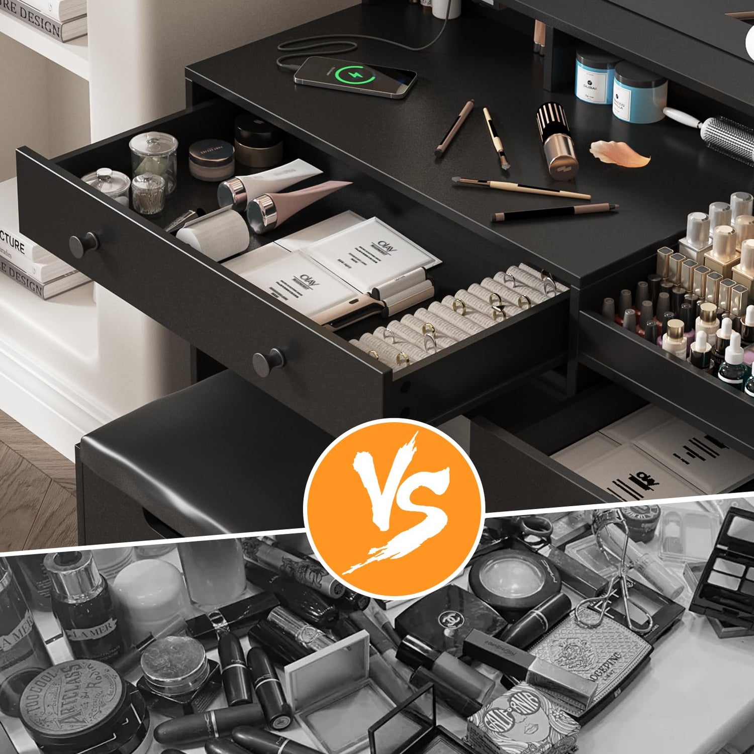 - 【Upgrade Functional Design】Built-in Charging Station, this vanity table set add 2 standard plug sockets and 2 USB ports, you can easily use hair dryer, curling iron in front the large mirror, and charge your phone or other mobile devices during makeup. Nice make up vanity for bedroom, dressing room, salon or live broadcast.