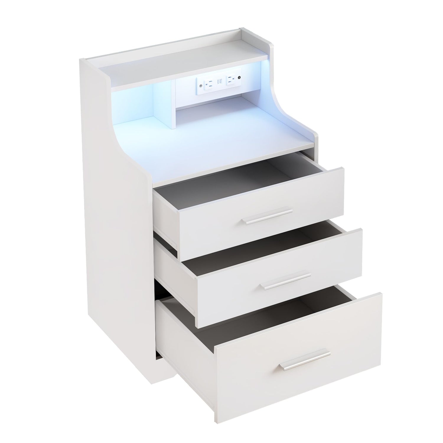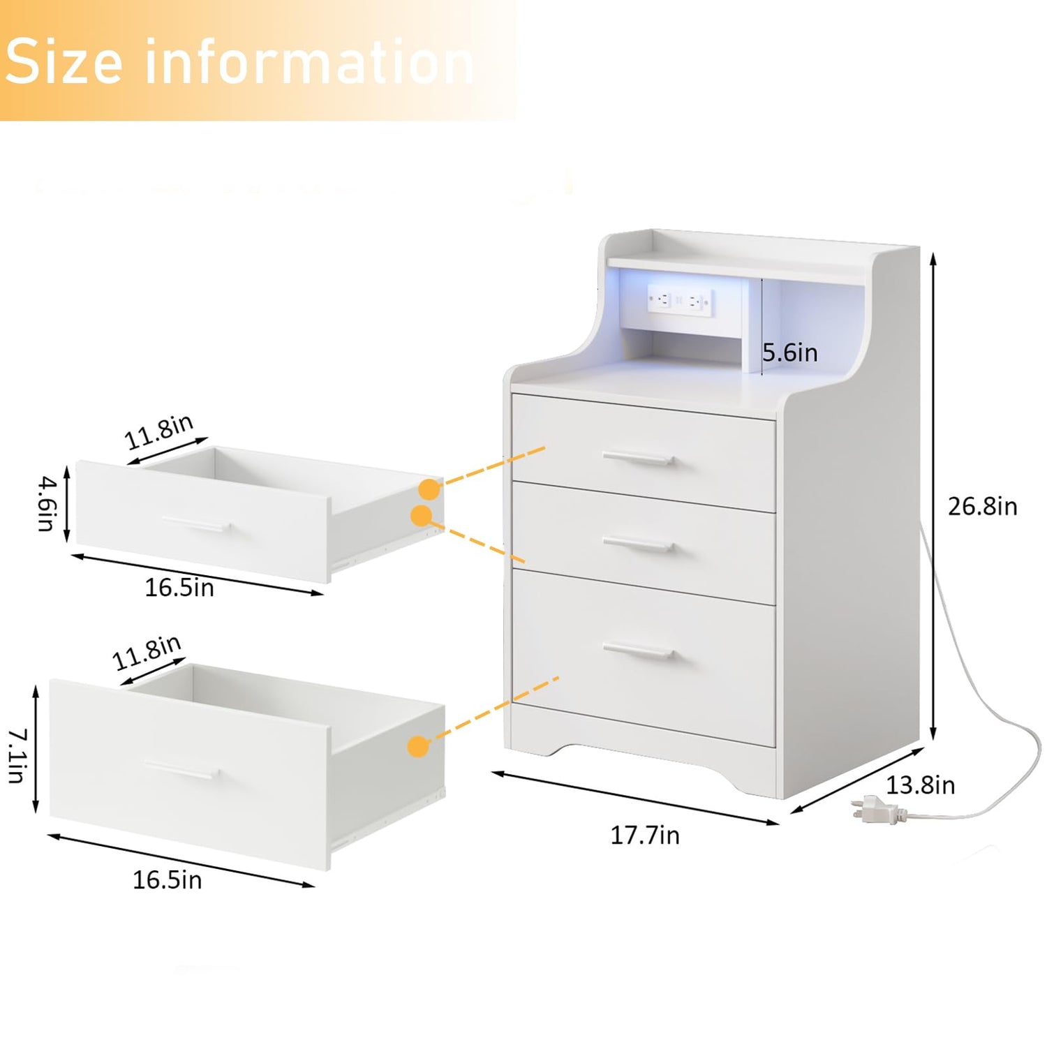 Details: Vabches new design white wood nightstand, bedroom nightstand with power strip (2 USB Ports and 2 outlet) add much convenience for daily use. This tall nightstand with 3 drawers and 2 open shelves, provide plenty of storage space to organize your daily essentials, books, CDs, jewelry, pen, earphone and cosmetics. This nightstand with usb, specially add high quality LED light strip, so you may enjoy the atmosphere light at day or night. Our tall nightstand with charging station, is a perfect choice night stand for girls bedroom Color: White Size: 17.7(W) * 13.8(D) * 26.8(H) inch Material: MDF Board