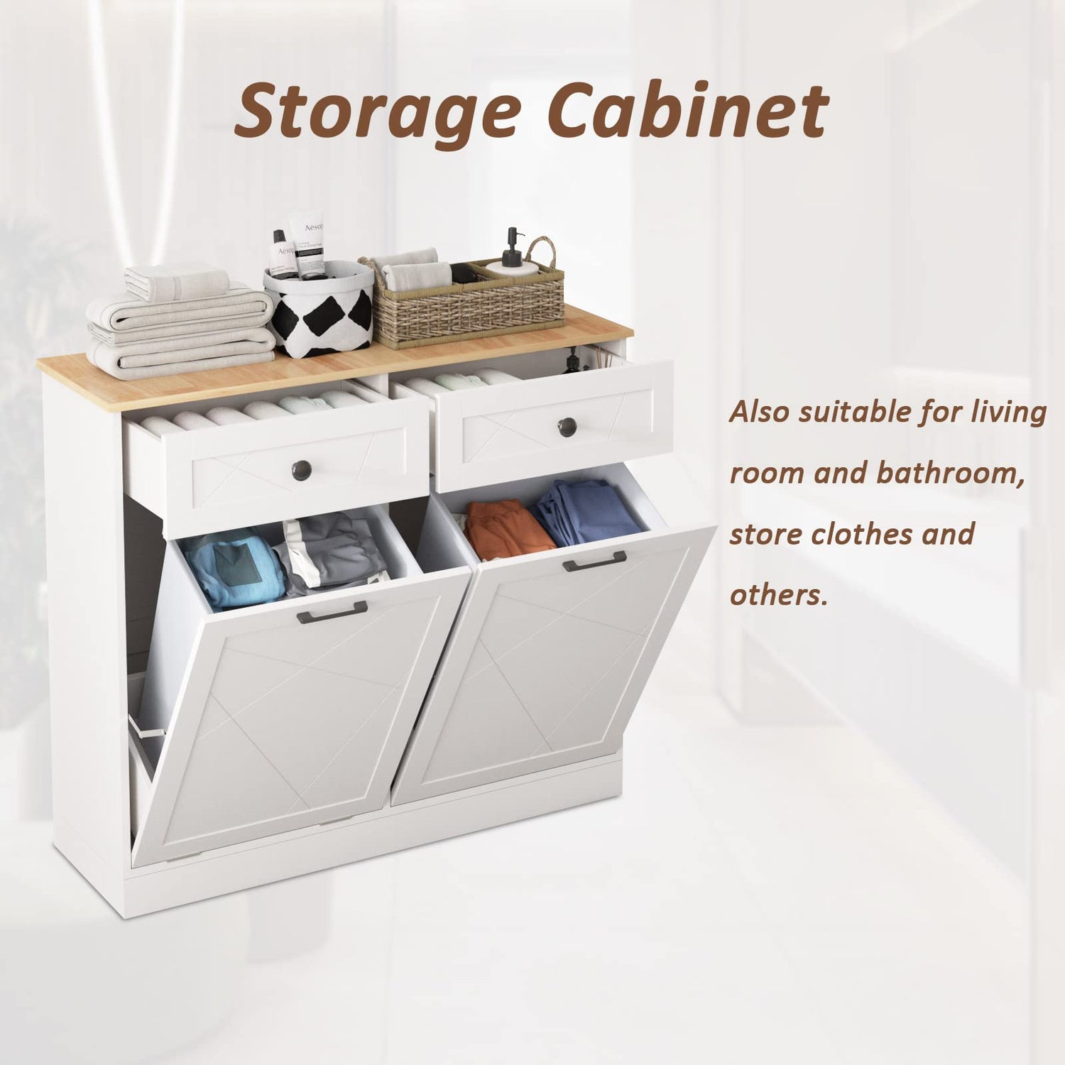 Vabches Trash Cabinet Double Trash Can, Dog Proof Tilt Out Trash Bin Holder, Hideaway Free Standing Recycling Cabinet with 2 Drawers for Kitchen Living Room White