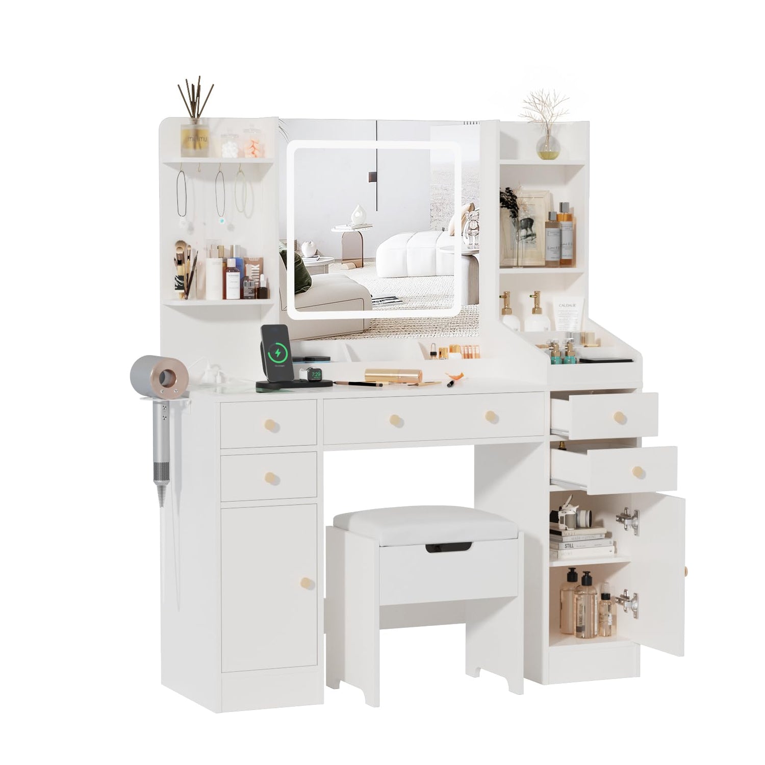 Vabches Vanity Desk with Lights, Makeup Vanity Table with Charging Station, 44.9in Big Vanity Set with 5 Drawers & Lots Storage Space, White
