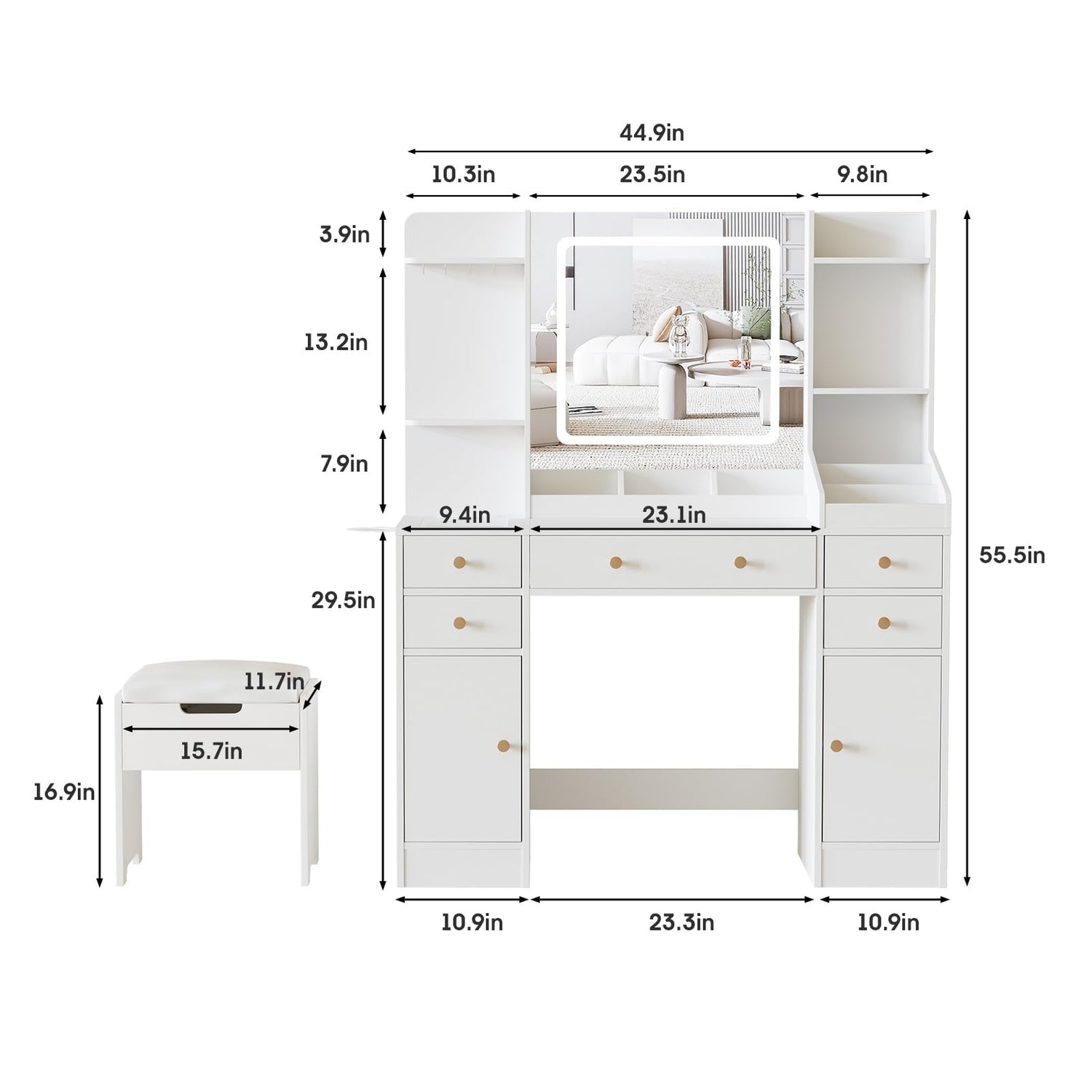 - đăLarge Vanity with Ample SpaceăPerfect size vanity set with mirror and stool: 44.9(W)*15.6(D)*53.6(H)in. 4 shelves and 3 makeup trays, and the setting of partition storage on the right, make this dressing table and your bedroom more tidy. 5 drawers and 2 side cabinets can storage your everything. Even the comfortable stool provides additional storage space.