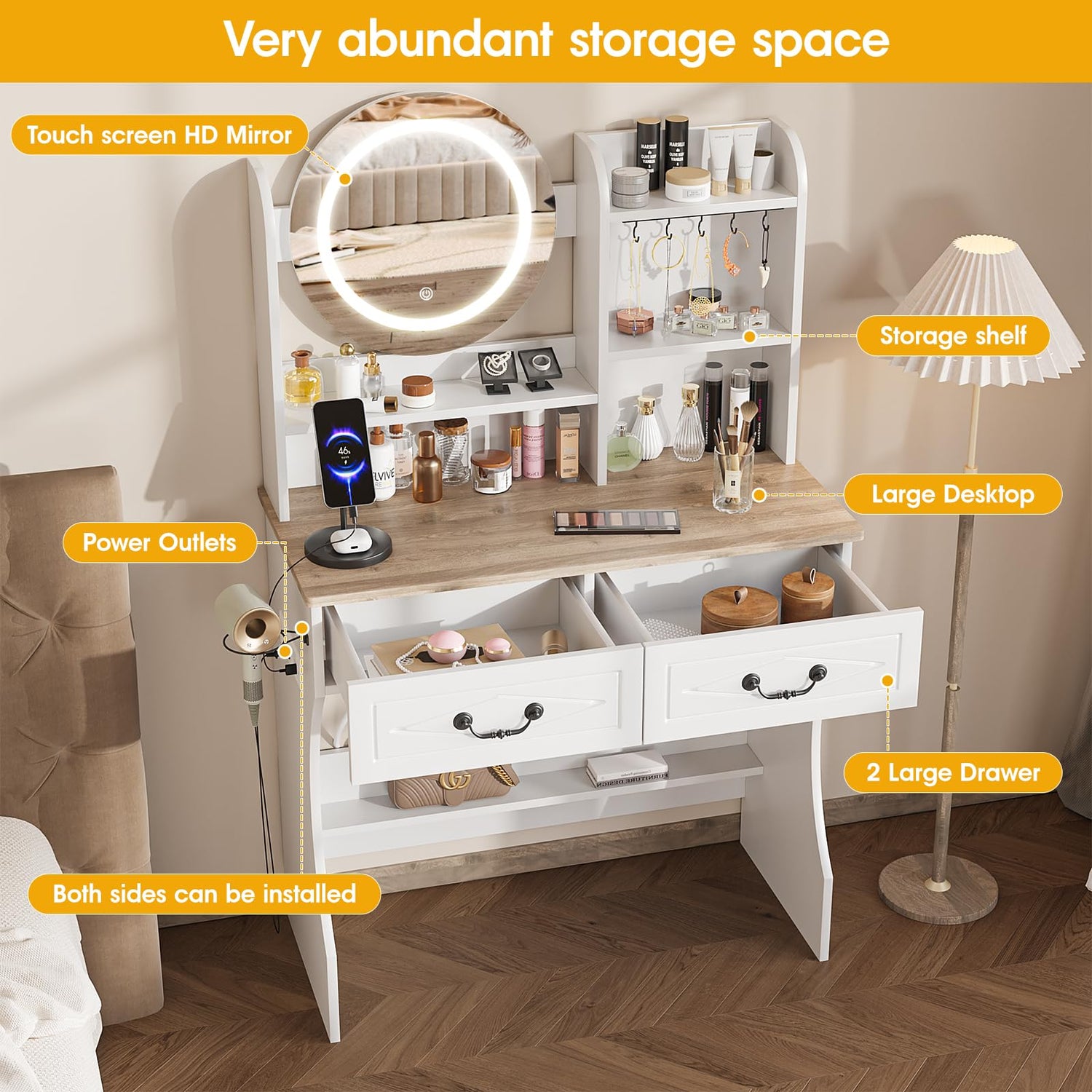 - The vanity comes with 2 drawers, 6 open shelves and a mirror with LED lights. One of the shelves has hooks capable of holding your fine accessories. The round makeup mirror makes the whole more coordinated and makes the room more beautiful. Perfect for home, work, hair salon and studio makeup.