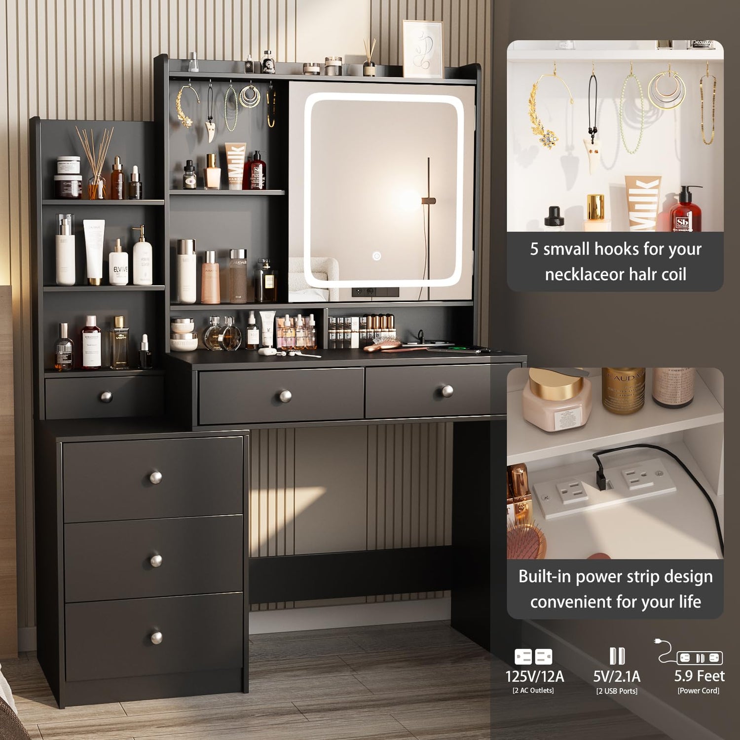 Vabches Vanity Desk with Mirror and Lights,Makeup Vanity with 6 Drawers and Shelves,Vanity Table with Power Outlet,Makeup Desk with Led Lighted Mirror in 3 Colors,for Bedroom,Black
