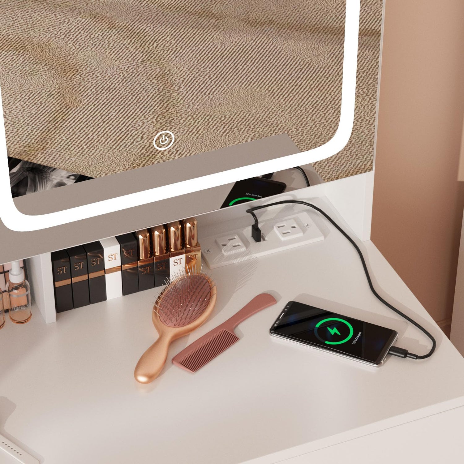 - Vanity Table With Charging Station:This makeup vanity features a charging station, includes 2 standard plug sockets and 2 USB ports, which can be more convenient to connect your hair dryer, and curling iron, and it can also charge your phone,tablet or other mobile devices,Nice make up vanity for dressing room, salon or Bedroom.