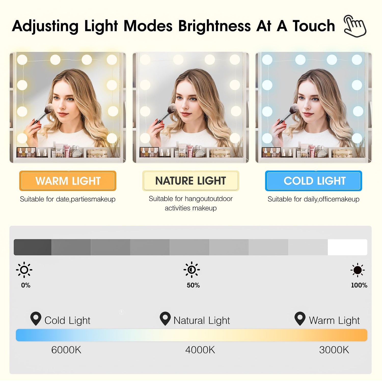 - [3 Lighting Modes and Brightness Adjustable] This wood vanity has a large mirror and ten LED bulbs with 3 different color modes: warm yellow, natural light, and dazzling white, to meet your various make-up needs.