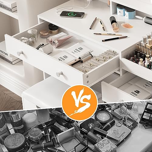 Vabches Vanity with Mirror and Lights, Makeup Vanity Table with Charging Station, Cute Vanity Set with Comfortable Bench, Big Vanity with 3 Storage Compartments, 39.8inch, White