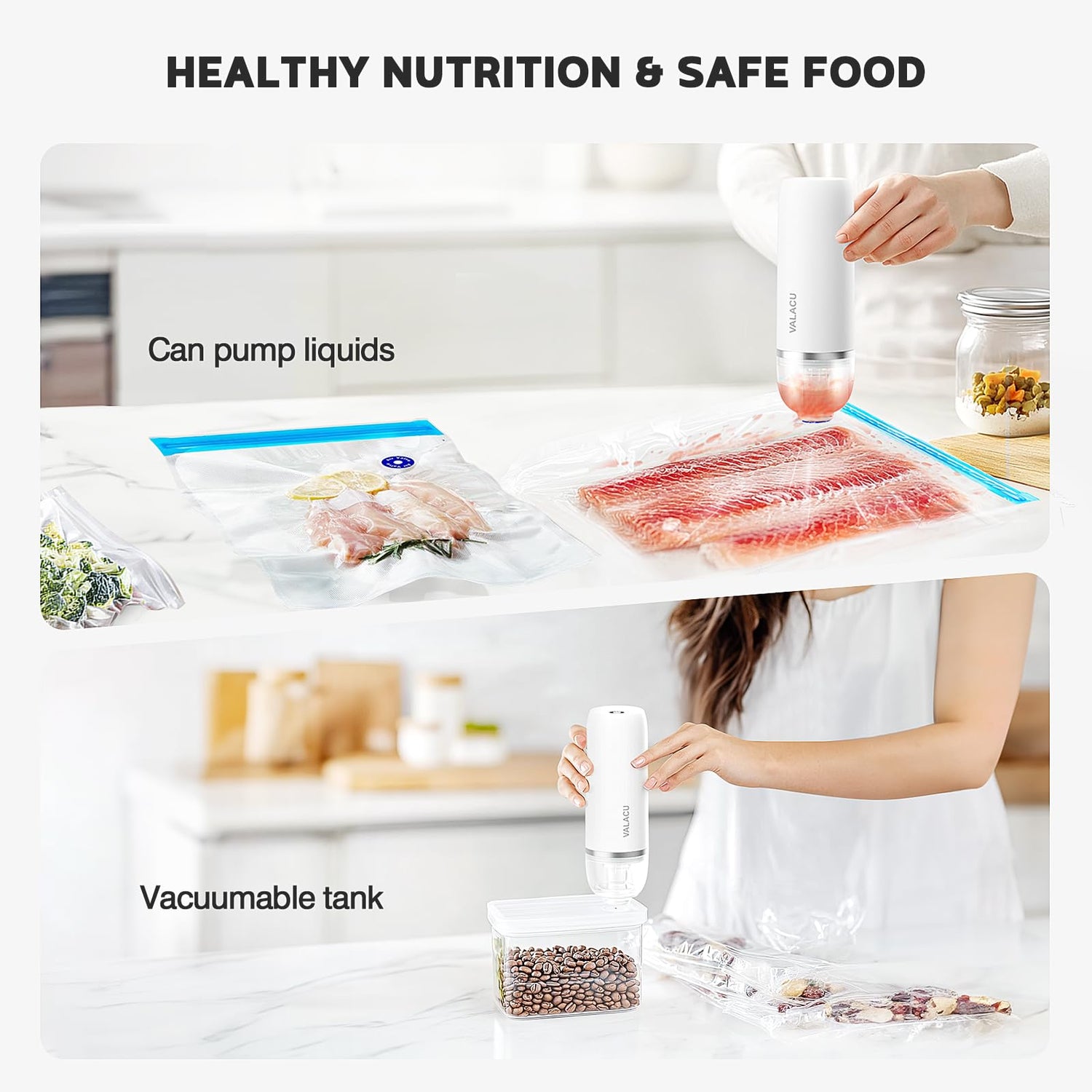 - Potable Design: The mini design of this hand held vacuum sealer for food is perfect for families or small homes with limited kitchen space. It not only saves space, is lightweight and easy to store, but is also particularly suitable for travel, camping, picnics and other outdoor activities. Its portability and efficiency make vacuum seal the ideal food preservation companion, whether for home food storage, traveling or outdoors. Easily store in your kitchen cabinet, travel backpack, or camping gear for a convenient food preservation experience