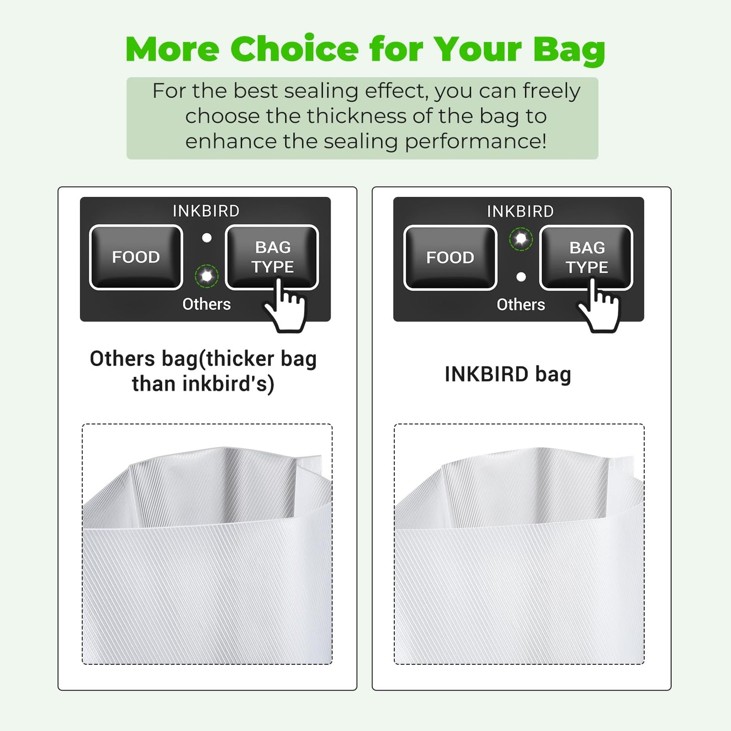 - More choose for Bag Type: The compact food sealer vacuum machine upgard bag type can be choosen, extra bag thickness options for all brand's vacuum bags on the market.It help to seal the bags well and no more burn. The food function is more specialized and refined. Ensures maximum air extraction when sealing moisture food items
