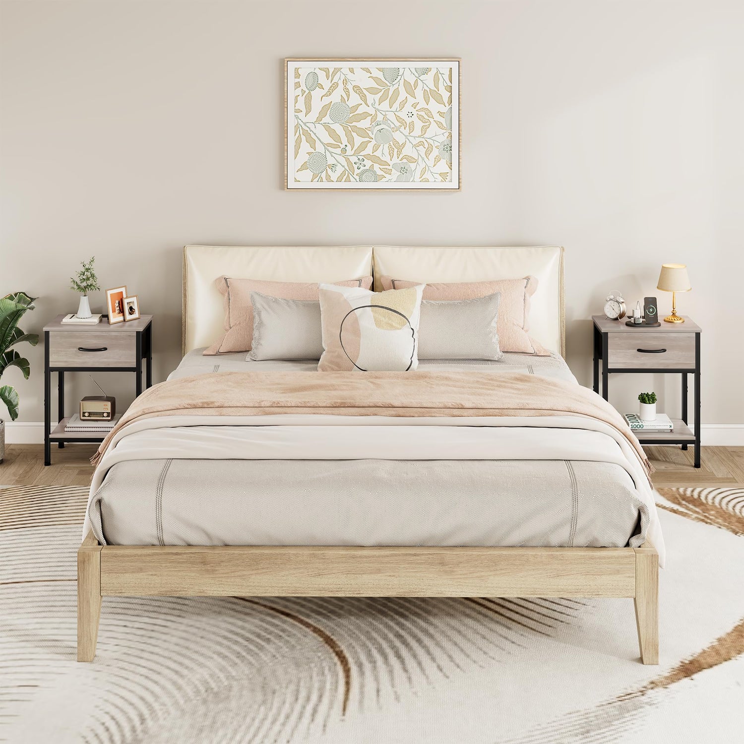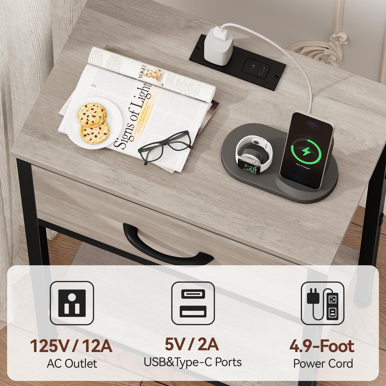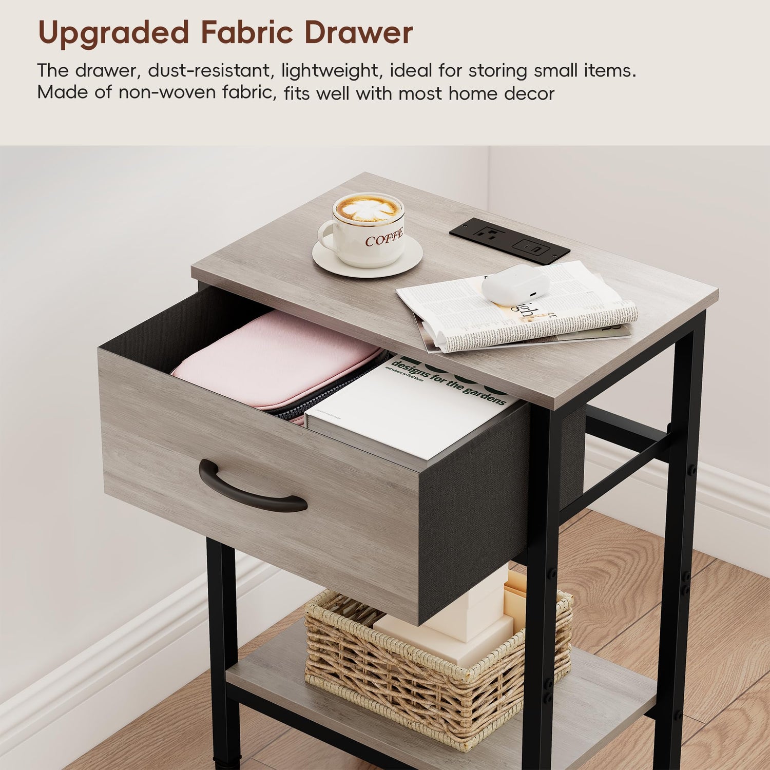 Vagusicc Nightstand Set of 2 with Charging Station, Bed Side Table with Fabric Drawer, Small End Table with 2-Tier Storage Shelves, 25.4" Tall Night Stand Bedside Table for Bedroom Living Room, Greige