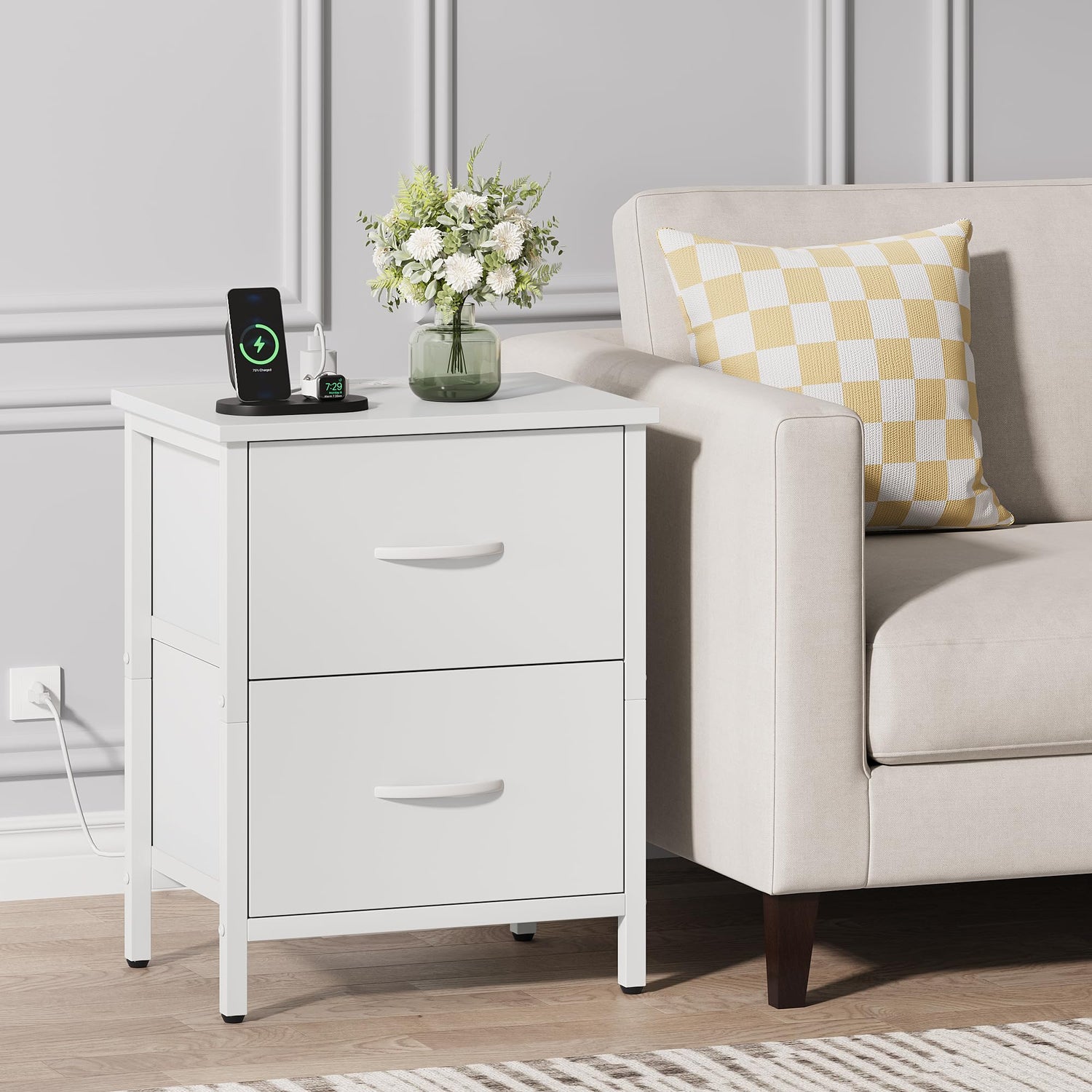 Vagusicc Nightstand Set of 2 with Charging Station, End Table Bedside Table with Power Outlet & USB Ports, Side Table with 2 Fabric Drawers for Bedroom, Living Room, White
