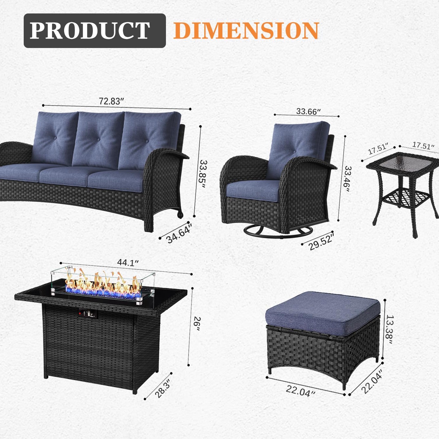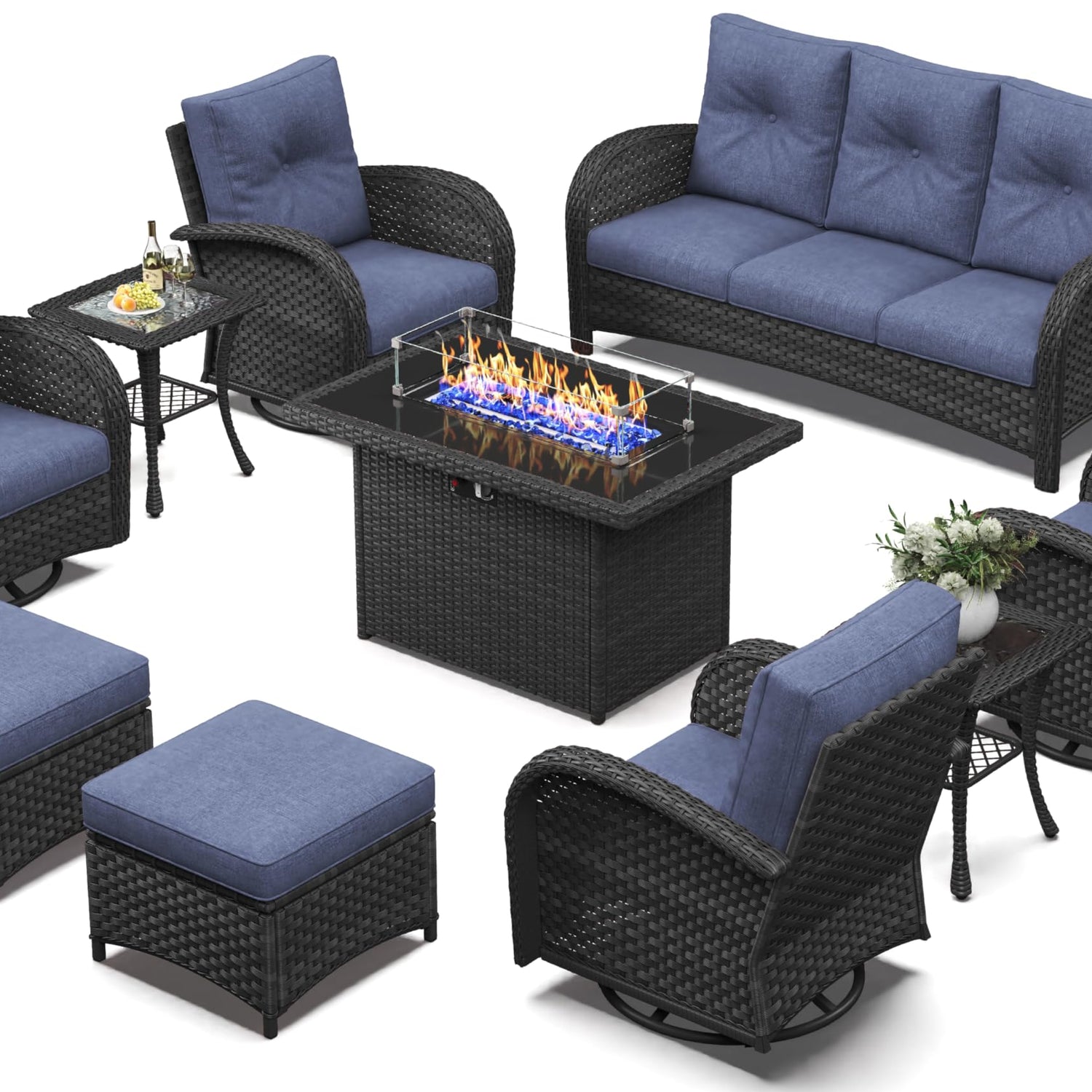 Vakollia 10 Pieces Patio Furniture Sets with Fire Pit Table, Wicker Rattan High Back Outdoor Swivel Rocking Chairs Set with 3-Seat Couch, Ottomans and Side Table
